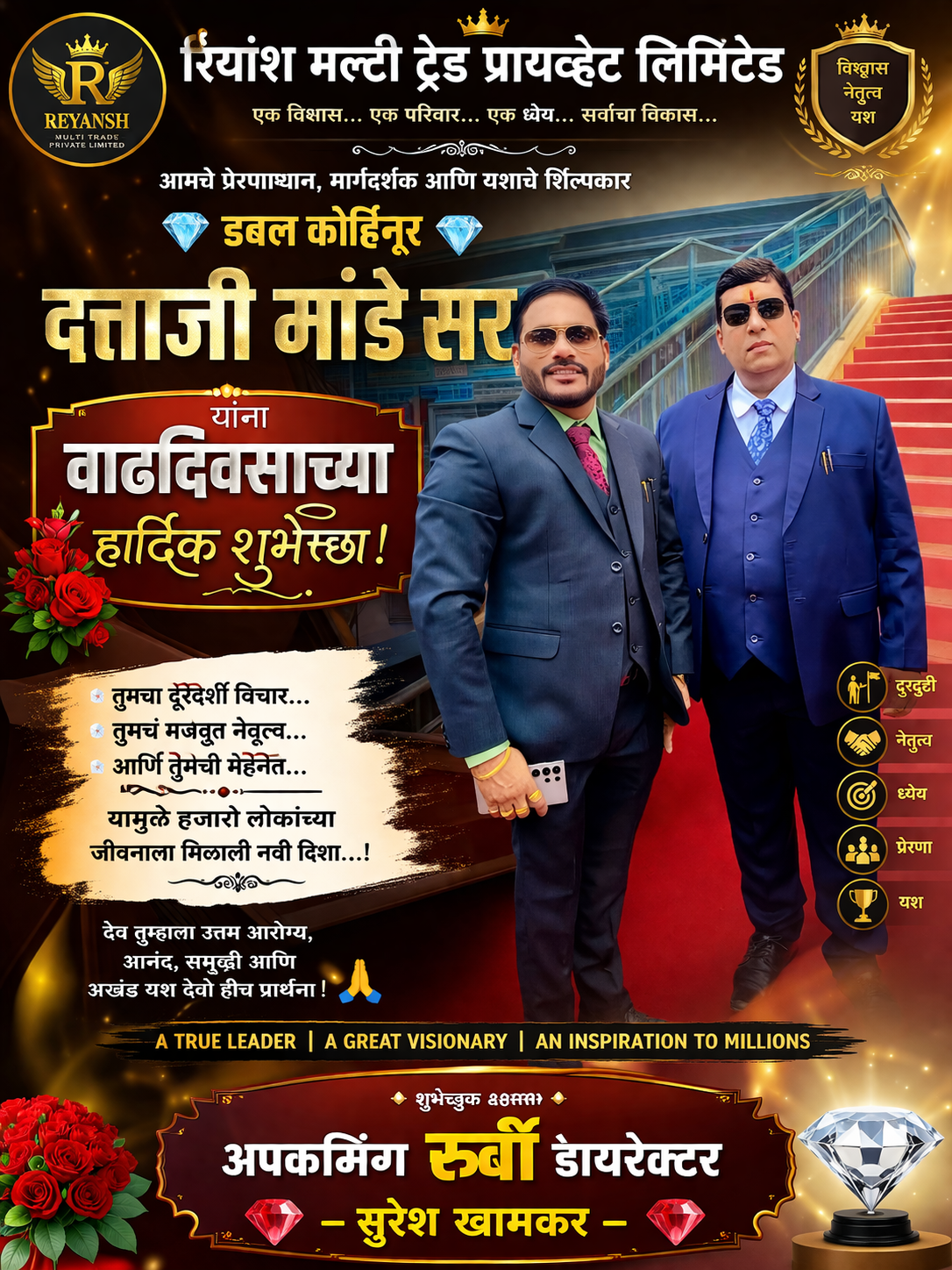 रियांश मल्टी ट्रेड प्राइवेट लिमिटेड के पहले डबल कोहिनूर, आदरणीय दत्ताजी मांडे सर का जन्मदिन बड़े उत्साह और उमंग के साथ मनाया गया। इस अवसर पर कंपनी के सदस्यों द्वारा एक विशेष कार्यक्रम का आयोजन किया गया, जिसमें बड़ी संख्या में लोगों ने सहभाग लिया।