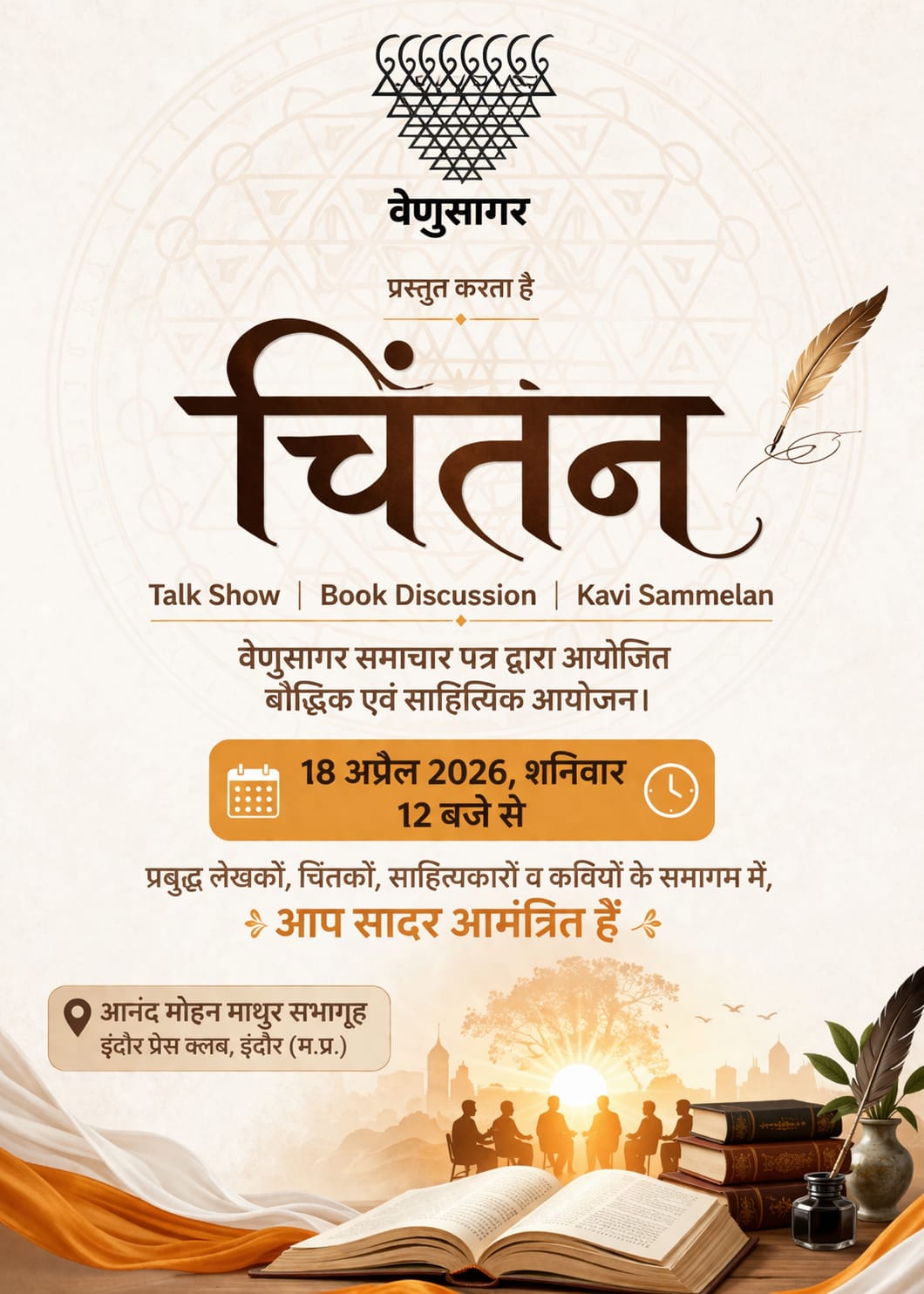 इंदौर। ‘वेणुसागर’ समाचार पत्र द्वारा एक भव्य एवं बहुआयामी साहित्यिक आयोजन “चिंतन” का आयोजन किया जा रहा है, जिसमें टॉक शो, पुस्तक चर्चा के साथ विशेष आकर्षण के रूप में एक गरिमामय अखिल भारतीय कवि सम्मेलन आयोजित होगा।