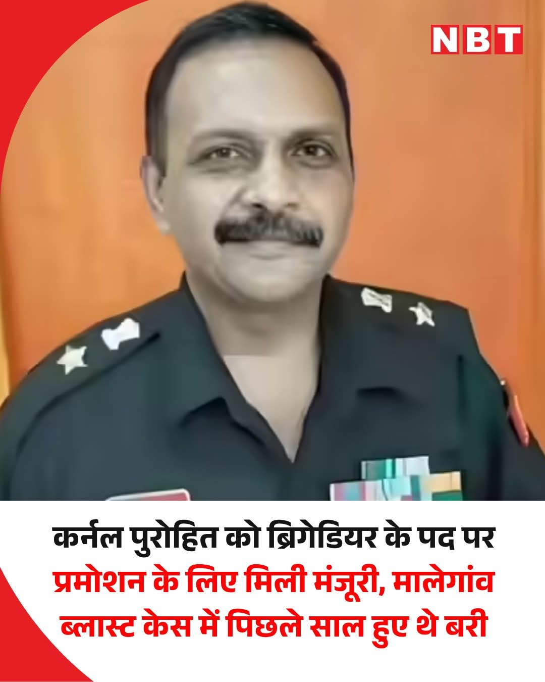मालेगांव ब्लास्ट केस में बरी हुए कर्नल पुरोहित को ब्रिगेडियर के पद पर प्रमोशन के लिए मंजूरी मिली गई है। एनआईए कोर्ट ने पिछले साल मालेगांव केस कर्नल पुरोहित समेत छह अन्य लोगों को बरी कर दिया था, जिसमें पूर्व बीजेपी सांसद प्रज्ञा सिंह ठाकुर भी शामिल थीं।मालेगांव ब्लास्ट केस में बरी हुए लेफ्टिनेंट कर्नल प्रसाद श्रीकांत पुरोहित को ब्रिगेडियर के पद पर प्रमोशन के लिए मंजूरी मिल गई है। एनआईए की एक कोर्ट ने जुलाई 2025 में मालेगांव केस में लेफ्टिनेंट कर्नल पुरोहित समेत छह अन्य लोगों को बरी कर दिया था, जिसमें पूर्व बीजेपी सांसद प्रज्ञा सिंह ठाकुर भी शामिल थीं।