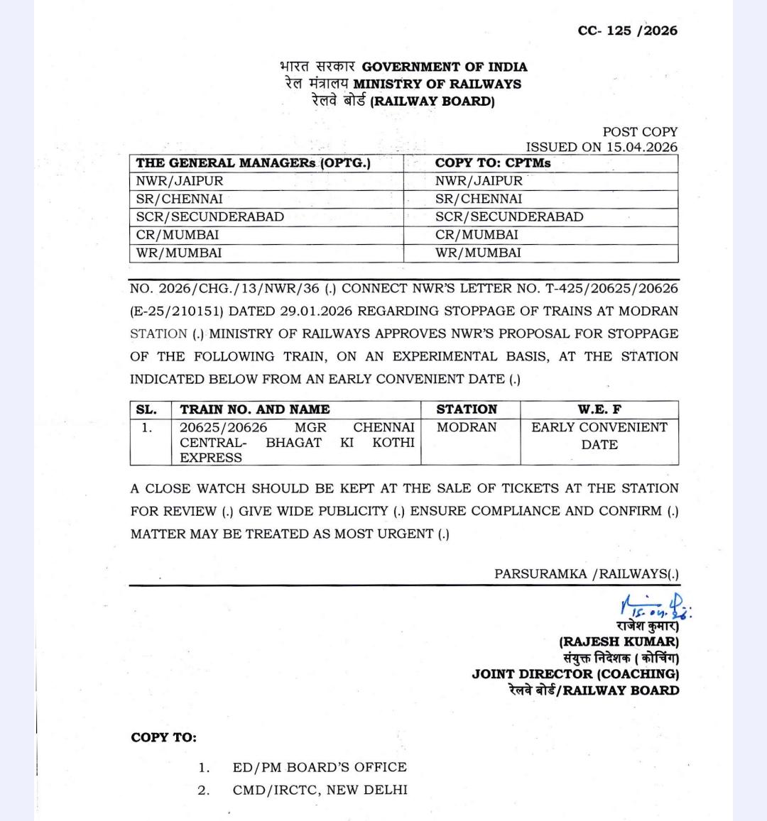 मोदरान रेलवे स्टेशन पर चैन्नई एक्सप्रेस के ठहराव को मिली मंजूरी, संघर्ष समितियों और सांसद के प्रयासों की बड़ी जीत