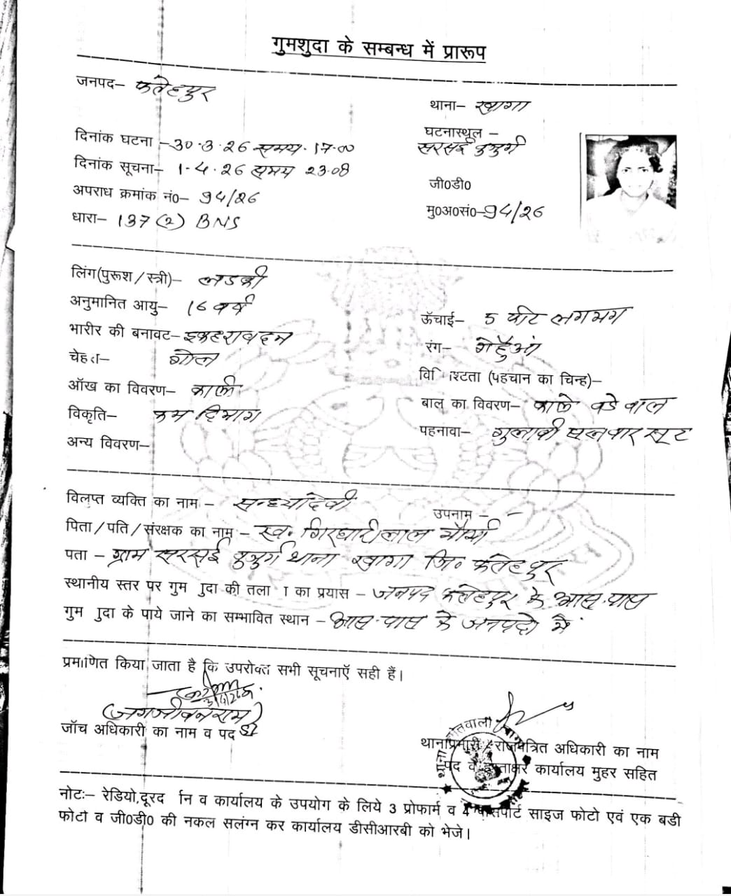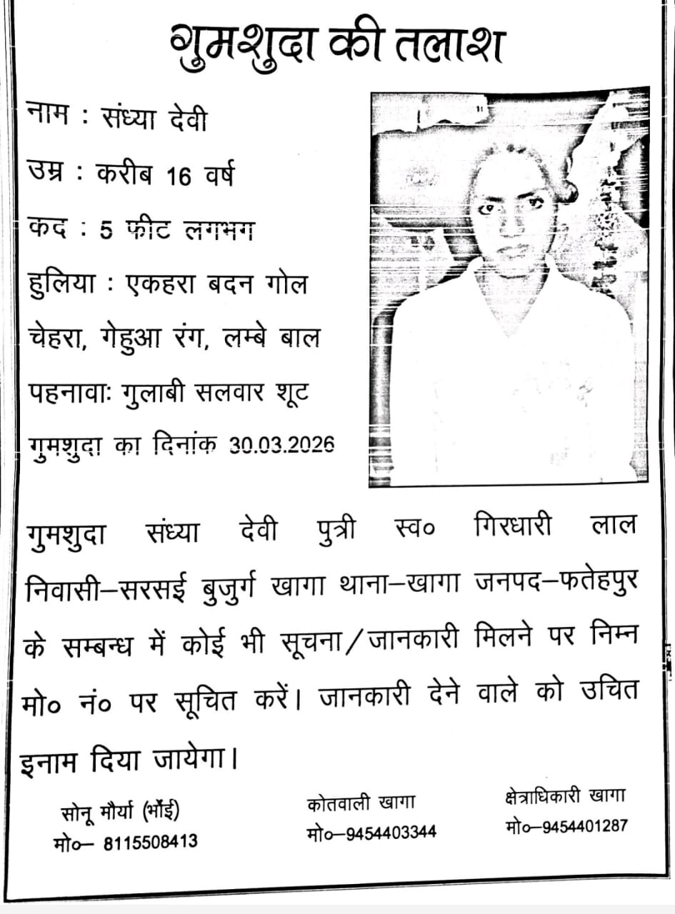 फतेहपुर जनपद के खागा तहसील क्षेत्र अंतर्गत सरसई बुजुर्ग गांव की रहने वाली एक नाबालिग किशोरी संदिग्ध परिस्थितियों में लापता हो गई है। प्राप्त जानकारी के अनुसार संध्या देवी (काल्पनिक नाम), उम्र लगभग 16 वर्ष, पुत्री स्वर्गीय गिरधारी लाल, दिनांक 30 मार्च 2026 को दोपहर करीब 2 बजे अपने घर से कहीं चली गई, जिसके बाद से उसका कोई पता नहीं चल सका है।