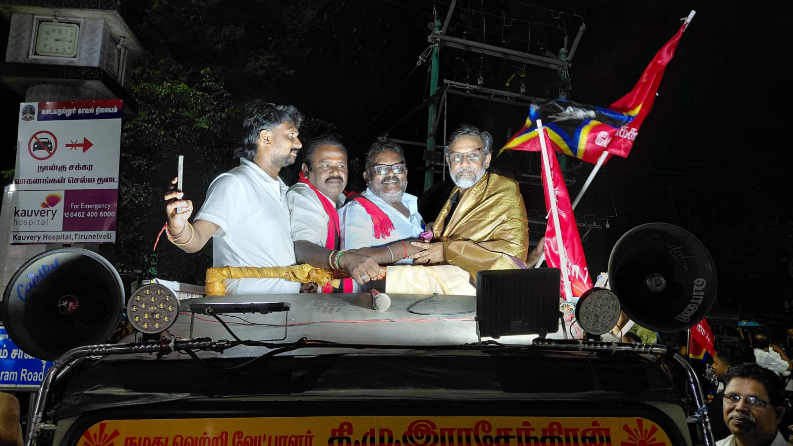 15/04/2026 அன்று தென்காசி மாவட்டம், கடையநல்லூர் சட்டமன்ற தொகுதியில் திமுக தலைமையிலான மதச்சார்பற்ற முற்போக்கு கூட்டணியின் மதிமுக வேட்பாளர் தி .மு. ராஜேந்திரன் அவர்களை ஆதரித்து,கடையநல்லூர் மணிக்கூண்டில் , மே 17 இயக்கத்தில் ஒருங்கிணைப்பாளர் முருகன் காந்தி அவர்கள் திமுகவின் உதயசூரியன் சின்னத்தில் வாக்களிக்குமாறு பொது மக்களிடம் வாக்கு சேகரித்தார்.
