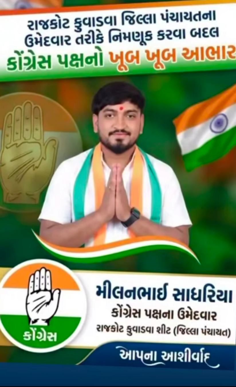 Gist of the poster: The name of Milanbhai Sagharia has been mentioned as a candidate Candidacy is shown for “Rajkot Kuwadwa District Panchayat”. Th