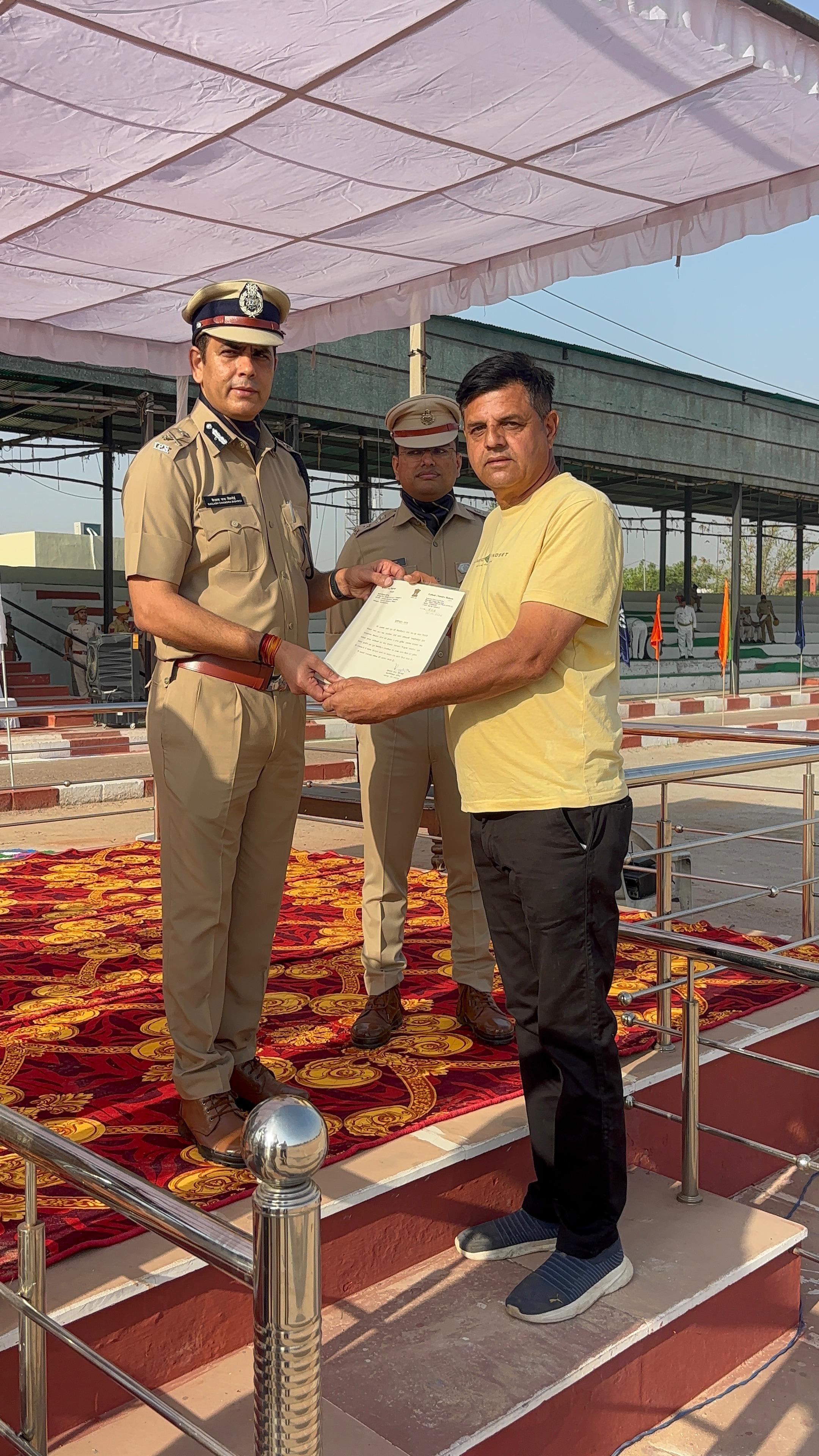 सवाई माधोपुर राजस्थान पुलिस स्थापना दिवस पर भरतपुर में आयोजित समारोह में भरतपुर रेंज के पुलिस महानिरीक्षक कैलाश चन्द्र बिश्नोई ने सेवा परमो धर्मः ग्रुप के सदस्य अवधेश शर्मा को प्रशस्ति पत्र प्रदान कर सम्मानित किया। शर्मा ने बताया कि सेवा परमो धर्मः ग्रुप में लगभग एक हजार सदस्य हैं जिनके सहयोग से ज़रूरतमंद बेसहारा लोगों का इलाज एवं आर्थिक सहायता, निर्धन एवं अज्ञात मृतकों का अंतिम संस्कार, गौसेवा, रक्तदान, शहीदों का सम्मान, वृक्षारोपण, राजकीय विद्यालयों में ऊनी वस्त्र वितरण आदि सामाजिक कार्य वर्षों से किए जा रहे हैं। समारोह में आमजन को सम्मानित किए जाने के क्रम में पुलिस थाना कोतवाली के इंचार्ज मदन लाल मीना एवं पुलिस अधीक्षक ज्येष्ठा मैत्रेयी द्वारा सवाई माधोपुर जिले से अवधेश शर्मा को प्रशस्ति पत्र प्रदान करने की अनुशंसा की गई थी। ग्रुप की ओर से अवधेश शर्मा ने कोतवाली इंचार्ज एवं पुलिस अधीक्षक का आभार व्यक्त किया।