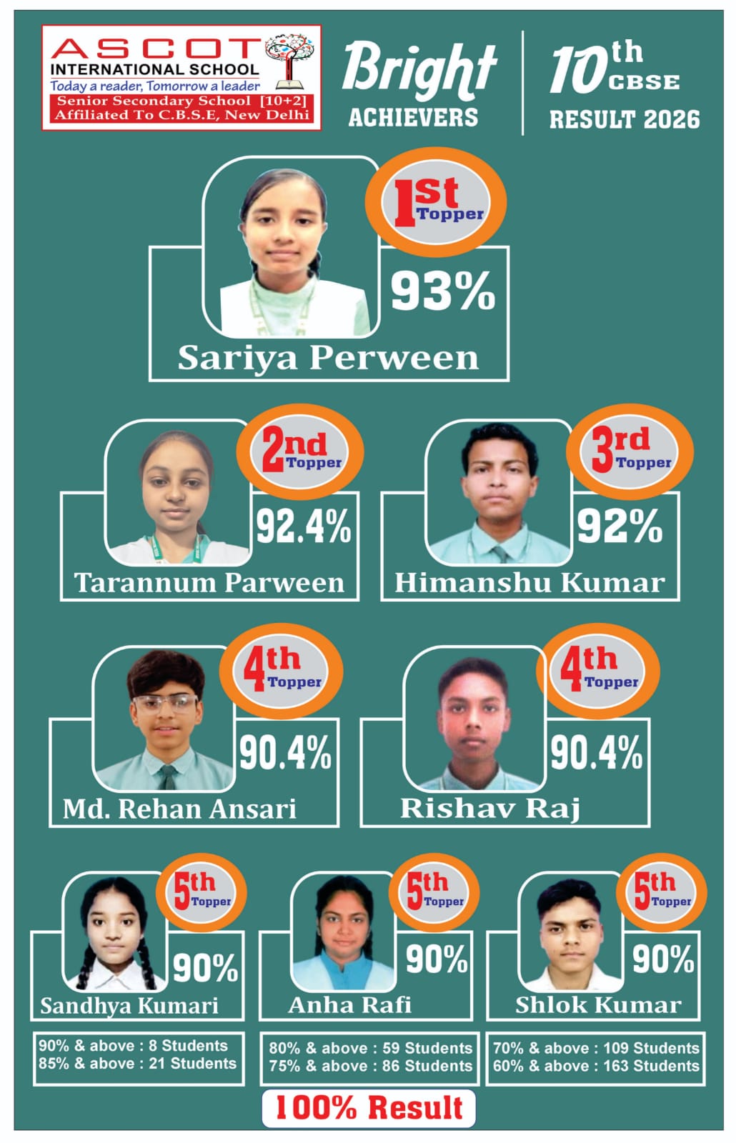 एस्कॉट इंटरनेशनल स्कूल का सीबीएसई दसवीं बोर्ड परीक्षा में शानदार प्रदर्शन, सारिया परवीन बनी विद्यालय टॉपर