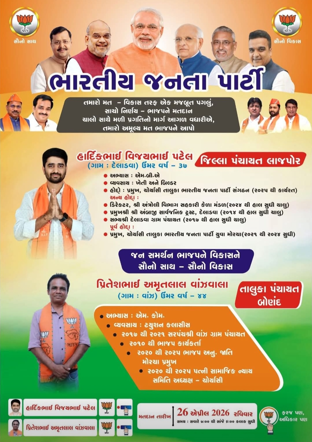 भारतीय जनता पार्टी के लाजपुर सीट के उम्मीदवार श्री हार्दिक विजयभाई पटेल तथा बोणंद सीट से वांझ गांव के पूर्व सरपंच श्री प्रितेश अमृतभाई वांझवाला को आगामी 26 अप्रैल 2026 को होने वाले चुनाव में भारी बहुमत से विजयी बनाने हेतु सभी मतदाताओं से विनम्र अपील की जाती है।