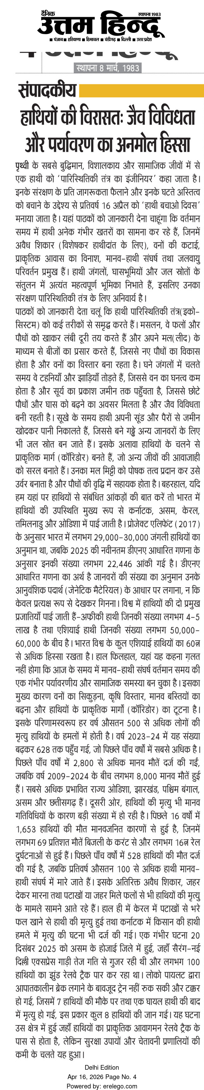 हाथी पृथ्वी के सबसे बुद्धिमान, विशालकाय और सामाजिक प्राणी हैं, जिन्हें 'पारिस्थितिकी तंत्र का इंजीनियर' कहा जाता है। प्रतिवर्ष 16 अप्रैल को 'हाथी बचाओ दिवस' मनाया जाता है ताकि इनके संरक्षण और घटती संख्या के प्रति जागरूकता फैलाई जा सके।