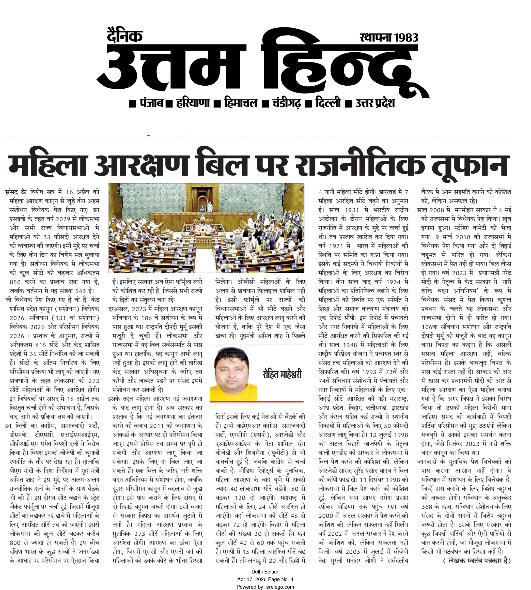 ​लेखक (रोहित माहेश्वरी) के अनुसार, इन विधेयकों को पास कराना आसान नहीं होगा क्योंकि इसके लिए संविधान के अनुच्छेद 368 के तहत संसद के दोनों सदनों में विशेष बहुमत की जरूरत है। राजनीतिक दल परिसीमन और जनगणना के मुद्दे पर सरकार को घेरने की तैयारी में हैं, जिससे आने वाले दिनों में संसद में गहमागहमी बढ़ने के पूरे आसार हैं।