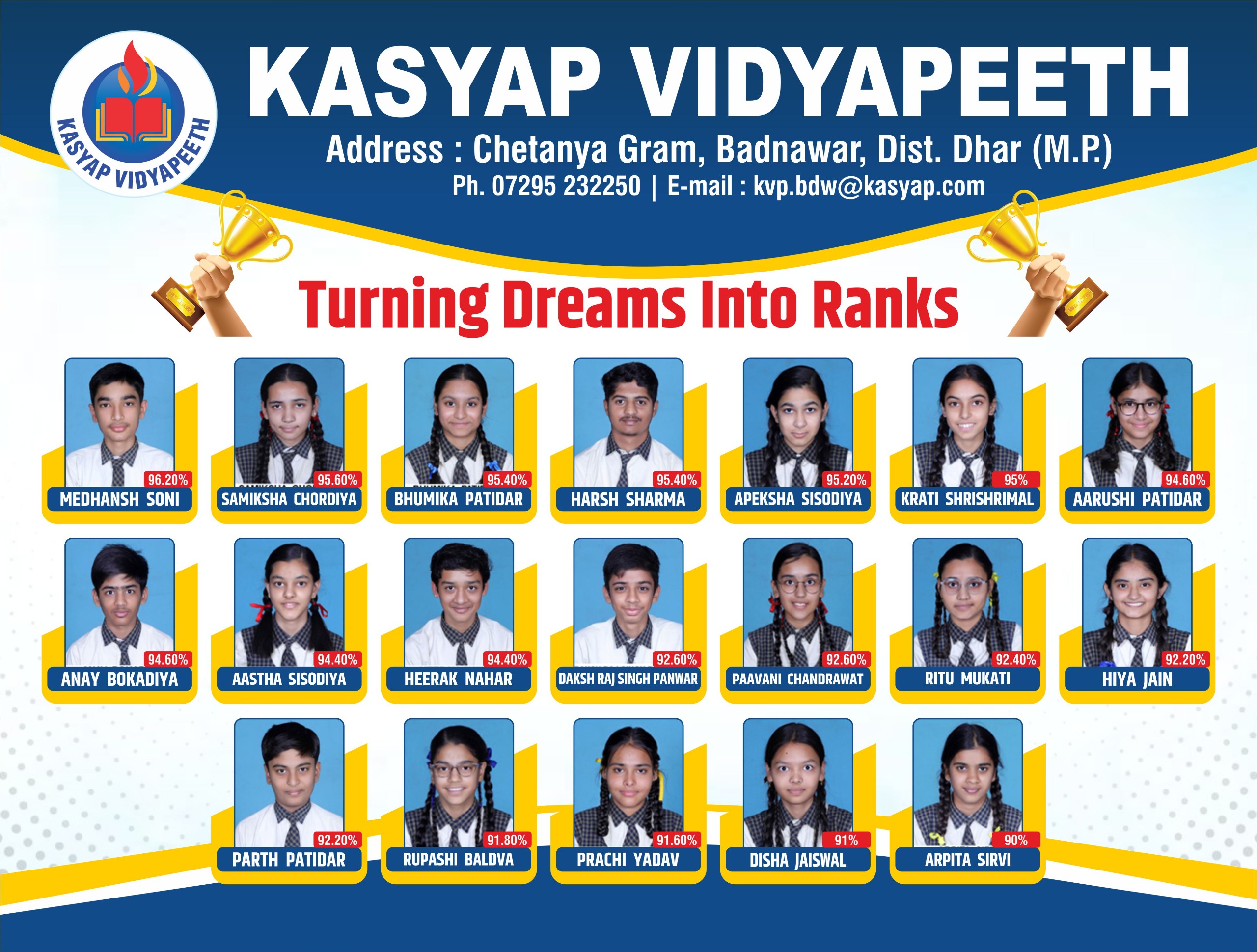 मेधांश सोनी (96.20%), समीक्षा चोरड़िया (95.60%), भूमिका पाटीदार (95.40%), हर्ष शर्मा (95.40%), अपेक्षा सिसोदिया (95.20%), कृति श्रीश्रीमाल (95.00%), आरुषि पाटीदार (94.60%), अनय बोकाड़िया (94.60%), आस्था सिसोदिया (94.40%), हीरक नाहर (94.40%), दक्ष राज सिंह पंवार (92.60%), पावनी चंद्रावत (92.60%), रितु मुकाती (92.40%), हिया जैन (92.20%), पार्थ पाटीदार (92.20%), रुपाशी बल्दवा (91.80%), प्राची यादव (91.60%), दिशा जायसवाल (91.00%) एवं अर्पिता सिर्वी (90.00%) शामिल हैं। एवं शेष विद्यार्थियों ने 75% से अधिक अंक प्राप्त किए