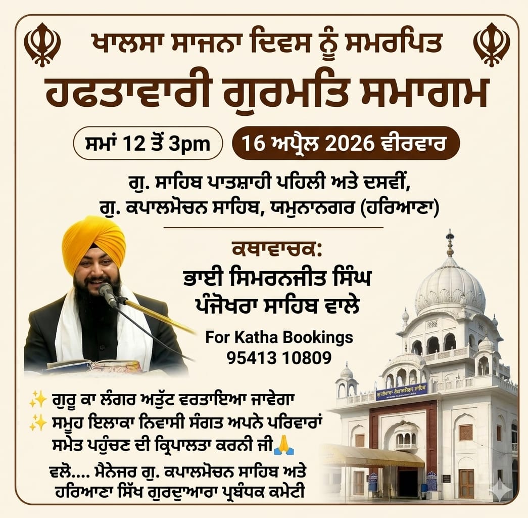 कपुरी :- 14 अप्रैल 2026 को गुरुद्वारा साहिब पातशाही पहली एवं दसवीं कपालमोचन ब्लॉक बिलासपुर जिला यमुनानगर - हरयाणा में बड़ी धूमधाम से मनाया गया, कीर्तन उपरांत गुरु का लंगर अटूट बरताया गया ! भारी संख्या में संगत नतमस्तक हुई!