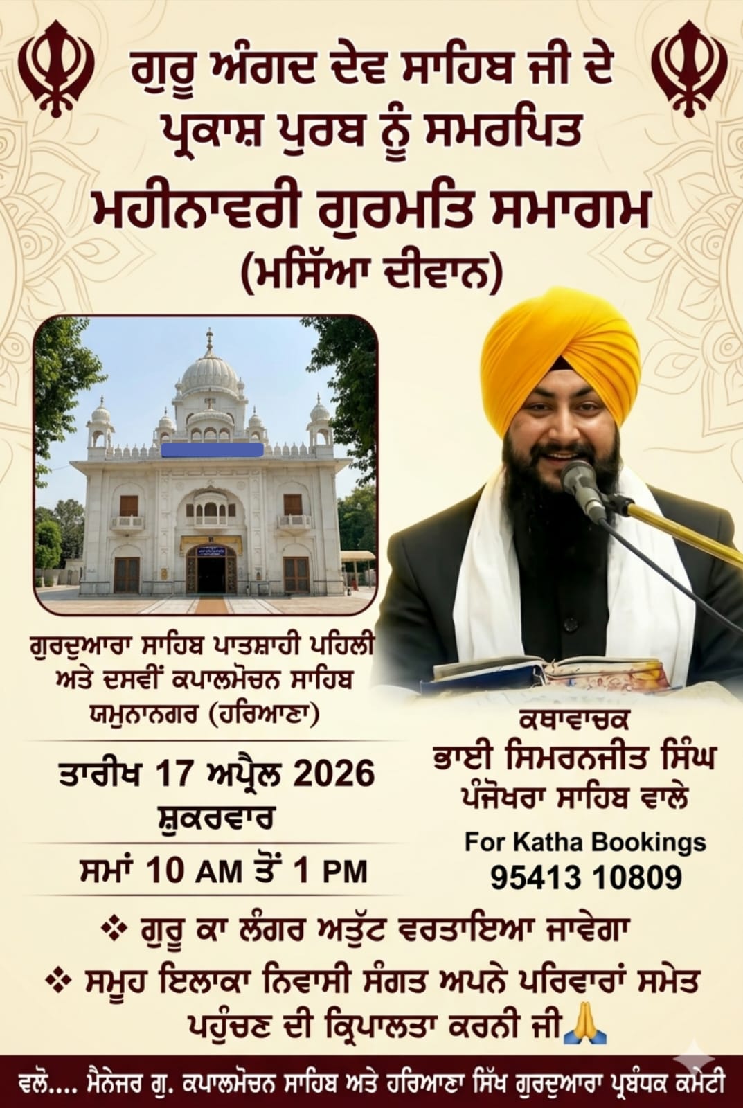 कपुरी :- 17 अप्रेल 2026, "मौस (अमावस)" गुरुद्वारा साहिब पातशाही पहली एवं दसवीं और गुरुद्वारा तम्बू साहिब पातशाही पहली एवं दसवीं छावणी निहंग सिंघाँ कपाल मोचन ब्लॉक बिलासपुर जिला यमुनानगर -हरयाणा में मनाई गई, कीर्तन उपरांत गुरु का लंवर अटूट बरताया गया! भारी संख्या में संगत नतमस्तक हुई !