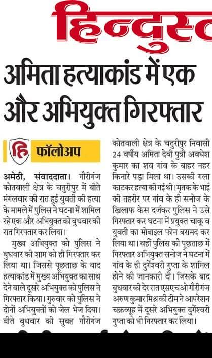 ब्रेकिंग न्यूज़ गौरीगंज अमेठी अमिता हत्याकांड में एक और अभियुक्त गिरफ्तार