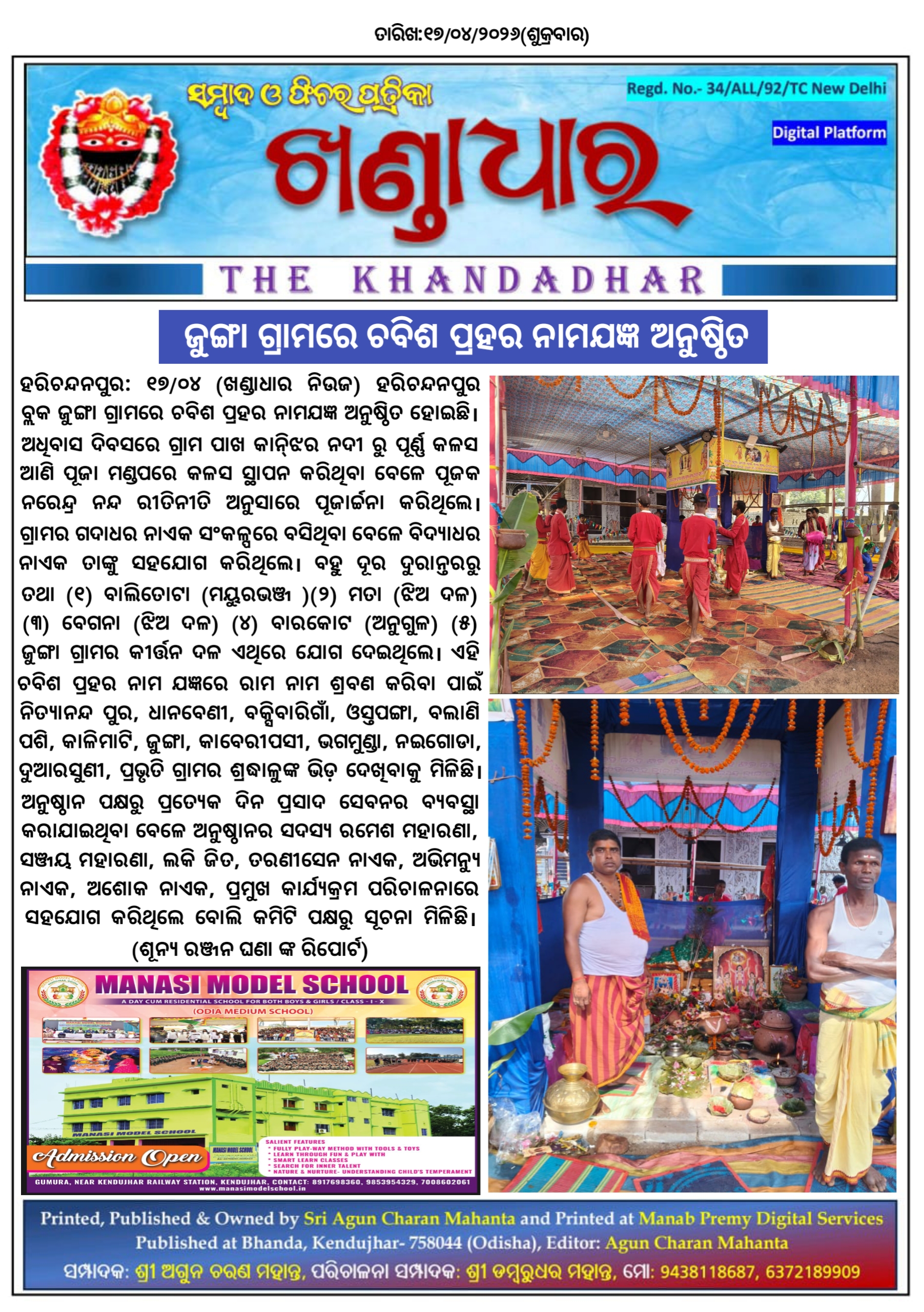 ହରିଚନ୍ଦନପୁର ୧୭/୦୪ (ଖଣ୍ଡାଧାର ନିଉଜ) ହରିଚନ୍ଦନପୁର ବ୍ଲକ ଜୁଙ୍ଗା ଗ୍ରାମରେ ଚବିଶ ପ୍ରହର ନାମଯଜ୍ଞ ଅନୁଷ୍ଠିତ ହୋଇଛି। ଅଧିବାସ ଦିବସରେ ଗ୍ରାମ ପାଖ କାନି୍ଝର ନଦୀ ରୁ ପୂର୍ଣ୍ଣ କଳସ ଆଣି ପୂଜା ମଣ୍ଡପରେ କଳସ ସ୍ଥାପନ କରିଥିବା ବେଳେ ପୂଜକ ନରେନ୍ଦ୍ର ନନ୍ଦ ରୀତିନୀତି ଅନୁସାରେ ପୂଜାର୍ଚ୍ଚନା କରିଥିଲେ। ଗ୍ରାମର ଗଦାଧର ନାଏକ ସଂକଳ୍ପରେ ବସିଥିବା ବେଳେ ବିଦ୍ୟାଧର ନାଏକ ତାଙ୍କୁ ସହଯୋଗ କରିଥିଲେ। ବହୁ ଦୂର ଦୁରାନ୍ତରୁ ତଥା (୧) ବାଲିତୋଟା (ମୟୁରଭଞ୍ଜ )(୨)ମତା (ଝିଅ ଦଳ )(୩) ବେଗନା (ଝିଅ ଦଳ )(୪) ବାରକୋଟ (ଅନୁଗୁଳ )(୫)ଜୁଙ୍ଗା ଗ୍ରାମର କୀର୍ତ୍ତନ ଦଳ ଏଥିରେ ଯୋଗ ଦେଇଥିଲେ। ଏହି ଚବିଶ ପ୍ରହର ନାମ ଯଜ୍ଞରେ ରାମ ନାମ ଶ୍ରବଣ କରିବା ପାଇଁ ନିତ୍ୟାନନ୍ଦ ପୁର , ଧାନବେଣୀ, ବକ୍ସିବାରିଗାଁ, ଓସ୍ତପଙ୍ଗା, ବଲାଣି ପଶି, କାଳିମାଟି, ଜୁଙ୍ଗା, କାବେରୀପସୀ, ଭଗମୁଣ୍ଡା, ନଇଗୋଡା, ଦୁଆରସୁଣୀ,ପ୍ରଭୃତି ଗ୍ରାମର ଶ୍ରଦ୍ଧାଳୁଙ୍କ ଭିଡ଼ ଦେଖିବାକୁ ମିଳିଛି। ଅନୁଷ୍ଠାନ ପକ୍ଷରୁ ପ୍ରତ୍ୟେକ ଦିନ ପ୍ରସାଦ ସେବନର ବ୍ୟବସ୍ଥା କରାଯାଇଥିବା ବେଳେ ଅନୁଷ୍ଠାନର ସଦସ୍ୟ ରମେଶ ମହାରଣା , ସଞ୍ଜୟ ମହାରଣା , ଲକି ଜିତ , ତରଣୀସେନ ନାଏକ, ଅଭିମନ୍ୟୁ ନାଏକ , ଅଶୋକ ନାଏକ , ପ୍ରମୁଖ କାର୍ଯ୍ୟକ୍ରମ ପରିଚାଳନାରେ ସହଯୋଗ କରିଥିଲେ ବୋଲି କମିଟି ପକ୍ଷରୁ ସୂଚନା ମିଳିଛି।
