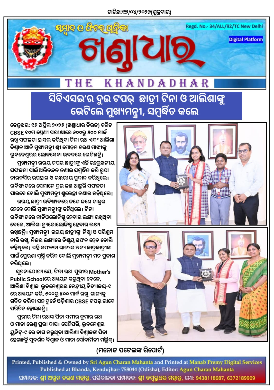 ଚଳିତ CBSE ୧୦ମ ଶ୍ରେଣୀ ପରୀକ୍ଷାରେ ୫୦୦ରୁ ୫୦୦ ମାର୍କ ରଖି ସଫଳତା ହାସଲ କରିଥିବା ଟିନା ରଥ ଏବଂ ଆଲିଶା ବିଶ୍ୱାଳ ଆଜି ମୁଖ୍ୟମନ୍ତ୍ରୀ ଶ୍ରୀ ମୋହନ ଚରଣ ମାଝୀଙ୍କୁ ଭୁବନେଶ୍ୱରର ଲୋକସେବା ଭବନରେ ଭେଟିଛନ୍ତି।