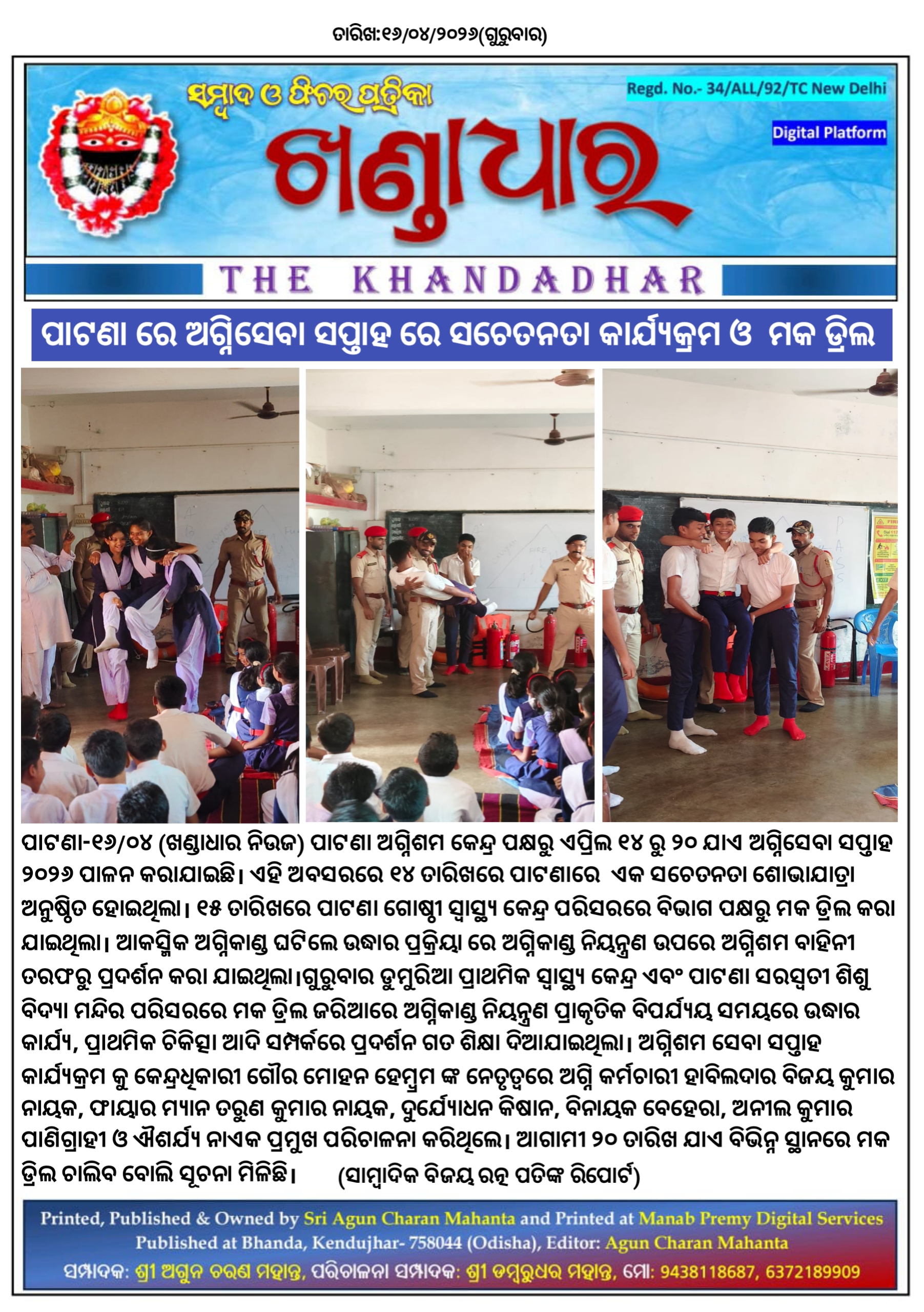 ପାଟଣା ରେ ଅଗ୍ନିସେବା ସପ୍ତାହ ରେ ସଚେତନତା କାର୍ଯ୍ୟକ୍ରମ ଓ ମକ ଡ୍ରିଲ।