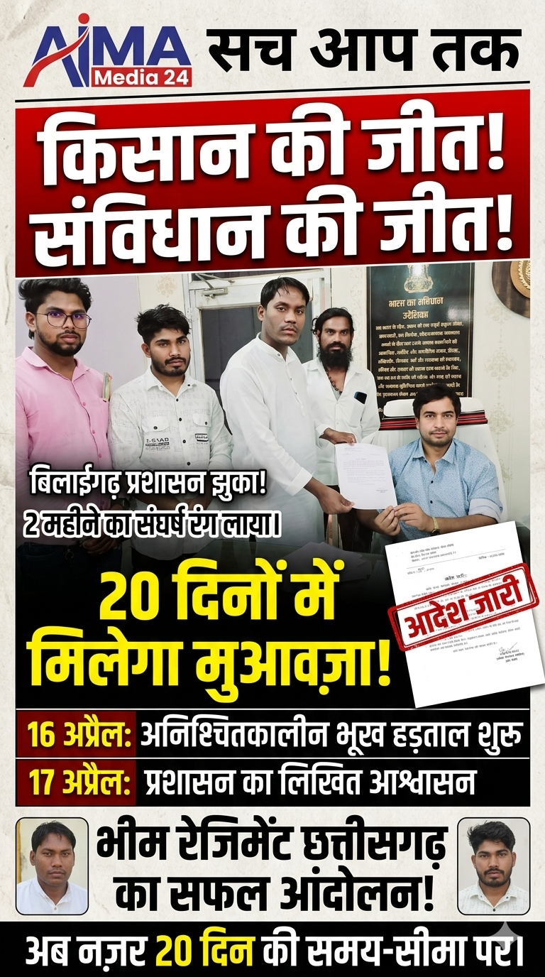 ​बिलाईगढ़। "जमीन गई पर मुआवजा नहीं" की लड़ाई लड़ रहे किसान और भीम रेजिमेंट के कार्यकर्ताओं के धैर्य की आखिरकार जीत हुई है। पिछले दो महीनों से जारी निरंतर आंदोलन और SDM कार्यालय के समक्ष बेमियादी भूख हड़ताल के बाद, बिलाईगढ़ प्रशासन ने झुकते हुए 20 दिनों के भीतर मुआवजा राशि भुगतान करने का लिखित आदेश जारी कर दिया है।