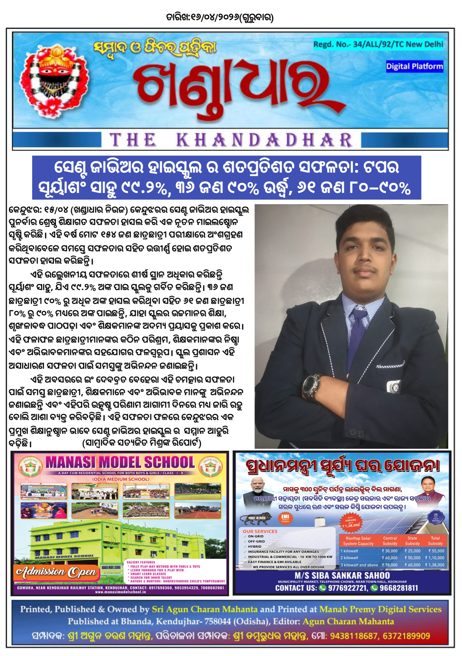 କେନ୍ଦୁଝର:୧୬/୦୪ (ଖଣ୍ଡାଧାର ନିଉଜ) କେନ୍ଦୁଝରର ସେଣ୍ଟ ଜାଭିଅର ହାଇସ୍କୁଲ ପୁନର୍ବାର ଶ୍ରେଷ୍ଠ ଶିକ୍ଷାଗତ ସଫଳତା ହାସଲ କରି ଏକ ନୂତନ ମାଇଲଷ୍ଟୋନ ସୃଷ୍ଟି କରିଛି। ଏହି ବର୍ଷ ମୋଟ ୧୫୪ ଜଣ ଛାତ୍ରଛାତ୍ରୀ ପରୀକ୍ଷାରେ ଅଂଶଗ୍ରହଣ କରିଥିବାବେଳେ ସମସ୍ତେ ସଫଳତାର ସହିତ ଉତ୍ତୀର୍ଣ୍ଣ ହୋଇ ଶତପ୍ରତିଶତ ସଫଳତା ହାସଲ କରିଛନ୍ତି।