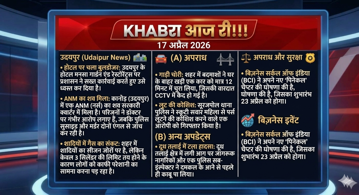 ANM का शव मिला: कानोड़ (उदयपुर) में एक ANM (नर्स) का शव सरकारी क्वार्टर में मिला है। परिजनों ने डॉक्टर पर गंभीर आरोप लगाए हैं, जबकि पुलिस सुसाइड और मर्डर दोनों एंगल से जांच कर रही है।