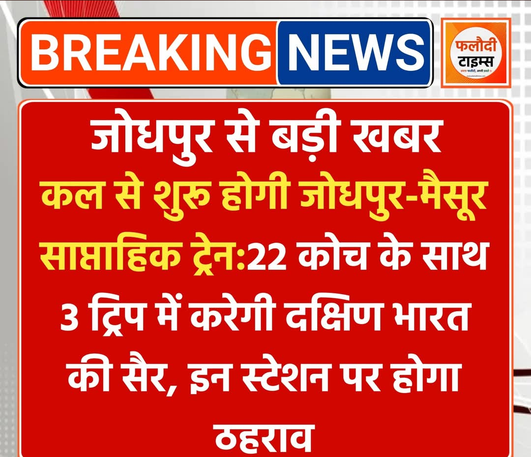 गर्मी की छुट्टियों में यात्रियों की बढ़ती भीड़ को देखते हुए रेलवे प्रशासन ने जोधपुर-मैसूर-जोधपुर साप्ताहिक समर स्पेशल ट्रेन चलाने का निर्णय लिया है। यह विशेष ट्रेन सीमित अवधि के लिए संचालित होगी और दक्षिण भारत की यात्रा करने वाले यात्रियों के लिए सुविधाजनक विकल्प साबित होगी।