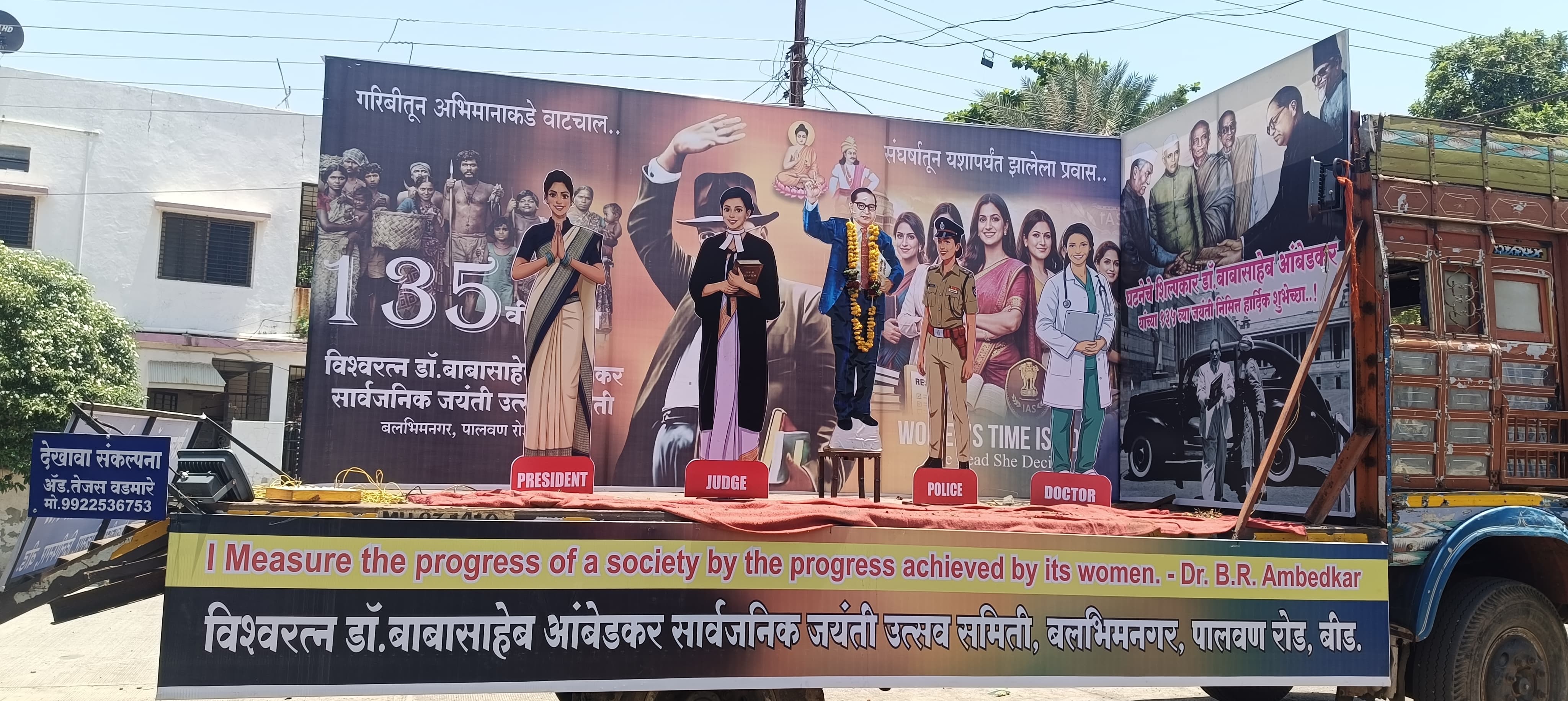धम्मदीप बुद्ध विहार, बलभीम नगर (पालवण रोड, शिवाजीनगर, बीड) येथे भारतरत्न डॉ. बाबासाहेब आंबेडकर यांच्या 135 व्या जयंतीनिमित्त जयंती उत्सव समितीच्या वतीने सादर करण्यात आलेल्या आकर्षक देखाव्यातून संविधानामुळे महिलांची झालेली प्रगती व समाजातील समता, बंधुता, न्याय व स्वातंत्र्याचा संदेश प्रभावीपणे मांडण्यात आला. या देखाव्याची संकल्पना आयु. डी. जी. वानखेडे बाबा व ॲड. तेजस वडमारे यांची असून सर्व स्तरातून त्याचे कौतुक होत आहे.