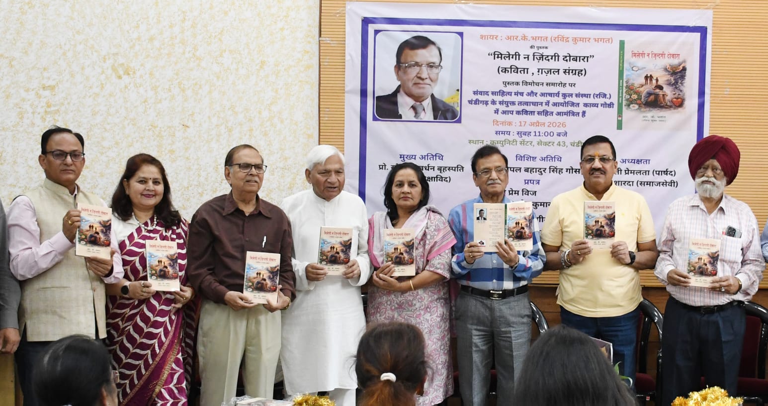 मनोज शर्मा, चंडीगढ़ । संवाद साहित्य मंच एवं आचार्यकुल, चण्डीगढ़ के संयुक्त तत्वावधान में सेक्टर 43 स्थित कम्युनिटी सेंटर में एक साहित्यिक कार्यक्रम का आयोजन किया गया। इस अवसर पर प्रसिद्ध शायर आर. के. भगत के नव प्रकाशित काव्य संग्रह “मिलेगी न ज़िंदगी दोबारा” का विधिवत विमोचन, समीक्षा चर्चा तथा काव्य पाठ आयोजित किया गया। कार्यक्रम के मुख्य अतिथि के रूप में प्रख्यात शिक्षाविद् प्रो. सौभाग्य वर्धन बृहस्पति उपस्थित रहे। विशिष्ट अतिथि के रूप में प्रिं. बहादुर सिंह गोसल उपस्थित रहे जबकि अध्यक्षता श्रीमती प्रेमलता (पार्षद) तथा समाजसेवी के. के. शारदा ने की। कार्यक्रम का संचालन प्रसिद्ध शायरा डॉ. संगीता शर्मा कुंद्रा ‘गीत’ द्वारा किया गया, जबकि प्रो. पल्लवी रामपाल ने सरस्वती वंदना प्रस्तुत कर कार्यक्रम का शुभारंभ किया। इस अवसर पर कविवर आर. के. भगत ने अपनी रचना प्रक्रिया पर प्रकाश डालते हुए अपनी चुनिंदा कविताओं का भावपूर्ण पाठ किया। मुख्य अतिथि प्रो. बृहस्पति ने अपने संबोधन में कहा कि कवि ने जीवन के विभिन्न पहलुओं को अत्यंत संवेदनशीलता के साथ अपनी रचनाओं में अभिव्यक्त किया है। उनकी कविताएं और ग़ज़लें आम जनमानस के जीवन से गहराई से जुड़ी हुई हैं। अध्यक्ष अध्यक्ष के रूप में बोलते हुए के. के .शारदा ने कहा कि श्री भगत की साहित्यिक यात्रा के साथ हम शुरू से जुड़े हुए हैं और उम्मीद करते हैं कि उनके साहित्यिक यात्रा ऐसे ही जारी रहेगी ।पार्षद, प्रेमलता ने भी श्री भगत को बधाई देते हुए कहा कि उन्होंने बहुत ही सुंदर कविताएं लिखी हैं। पुस्तक पर अपने विचार व्यक्त करते हुए साहित्यकार प्रेम विज ने कहा कि यह काव्य संग्रह केवल रचनाओं का संकलन नहीं, बल्कि जीवन के विविध रंगों, विरोधाभासों और अनुभवों का सजीव प्रतिबिंब है। वहीं डॉ. विनोद कुमार शर्मा ने कहा कि आर. के. भगत की रचनाओं में सामाजिक यथार्थ, मानवीय संवेदनाएं और गहन चिंतन स्पष्ट रूप से परिलक्षित होते हैं। कार्यक्रम में अजय भगत एवं राज विज ने भी अपने विचार साझा किए। इस अवसर पर कवि के परिवार से उनकी पत्नी सुदेश, बहू संध्या, पोत्र ध्रुव एवं पोत्री टीना भी उपस्थित रहे। काव्य गोष्ठी के अंतर्गत नीना सैनी, विमला गुगलानी, किरण आहूजा, डॉ. शशि प्रभा, डॉ. प्रज्ञा शारदा, सुरिंदर कुमार, प्रो. पल्लवी रामपाल, कर्म सिंह ‘वकील’, बी. डी. ठाकुर, ललिता पुरी एवं डॉ. संगीता शर्मा कुंद्रा ‘गीत’ ने अपनी-अपनी रचनाओं का सुंदर पाठ किया ।