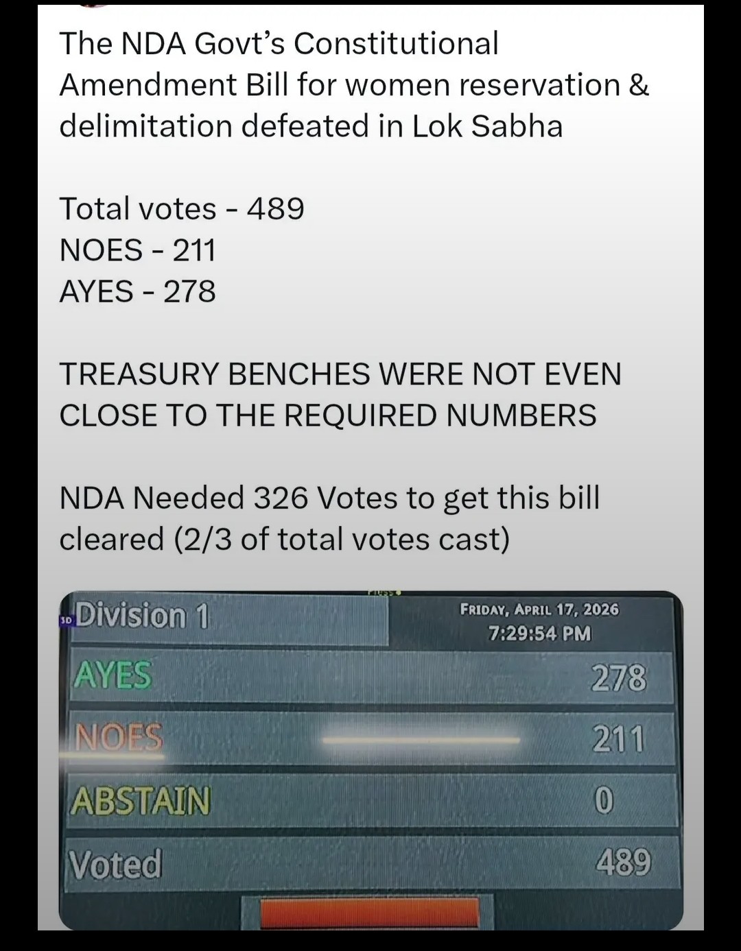 Constitution amendment bill for reservation defeated in lok sabha today evening