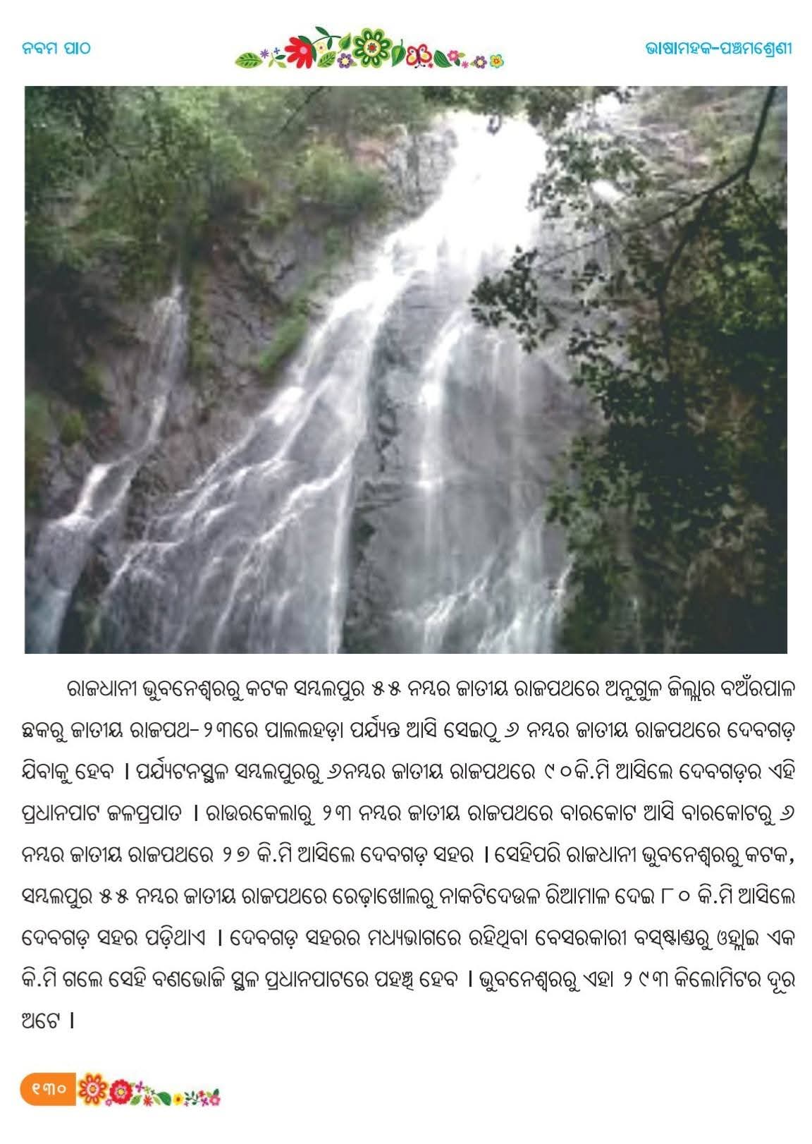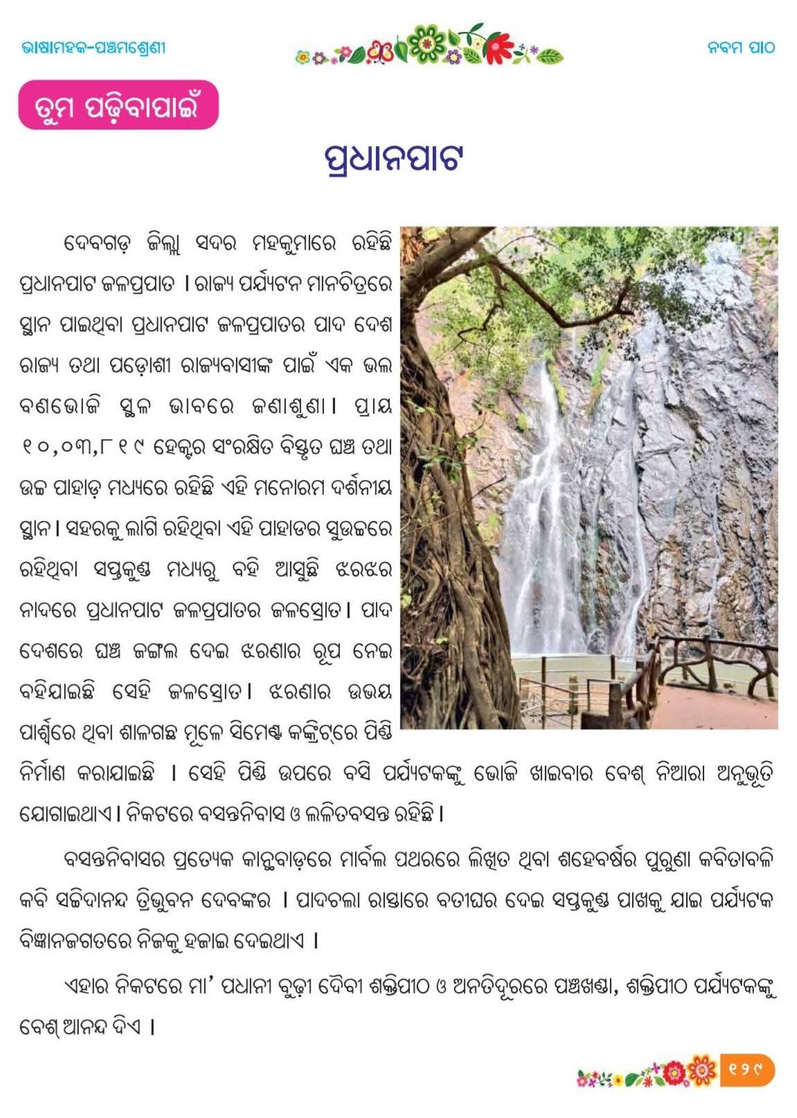 ଦେବଗଡ଼: ଦେବଗଡ଼ ଜିଲ୍ଲାର ପ୍ରସିଦ୍ଧ ପର୍ଯ୍ୟଟନ ସ୍ଥଳୀ ପ୍ରଧାନପାଟ ଜଳପ୍ରପାତ ଓଡିଶା ସହ ରାଜ୍ୟ ବାହାରେ ମଧ୍ୟ ସୁପରିଚିତ ଓ ଲୋକପ୍ରିୟତା ଅର୍ଜନ କରିଛି। ଏବେ ଏହି ପ୍ରସିଦ୍ଧ ଜଳପ୍ରପାତ ପଞ୍ଚମ ଶ୍ରେଣୀର ‘ଭାଷା ମହକ’ ପାଠ୍ୟପୁସ୍ତକରେ ସ୍ଥାନ ପାଇବା ଦ୍ୱାରା ଏହାର ଗୌରବ ଆହୁରି ବୃଦ୍ଧି ପାଇଛି।