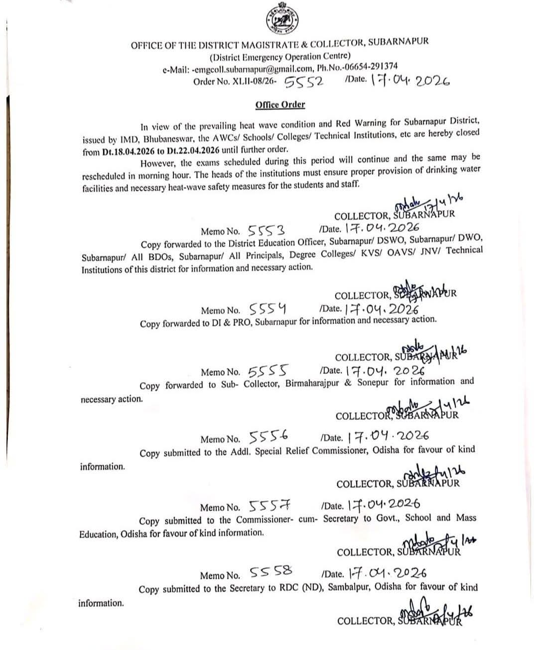 ସୋନପୂର୍ ପ୍ରବଳ ଖରା ହେତୁ ଜିଲ୍ଲପାଳ ଙ୍କ ନିର୍ଦ୍ଦେଶ ରେ 18 ତାରିଖ ରୁ 22 ତାରିଖ ପର୍ଯ୍ୟନ୍ତ ଛୁଟି ନିର୍ଦେଶ ଦେଇଛନ୍ତି ।