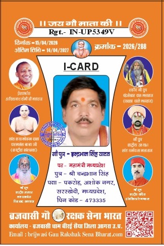 ग्वालियर/इंदौर: ब्रजवासी गौ रक्षक सेना भारत संगठन ने अपनी प्रदेश कार्यकारिणी का विस्तार करते हुए इंद्रभान सिंह यादव को मध्यप्रदेश का महामंत्री नियुक्त किया है। यह नियुक्ति संगठन के राष्ट्रीय अध्यक्ष गौ पुत्र धर्म दास महाराज के मार्गदर्शन में और मध्यप्रदेश उपाध्यक्ष गौ पुत्र राम दयाल सिंह यादव द्वारा की गई है।