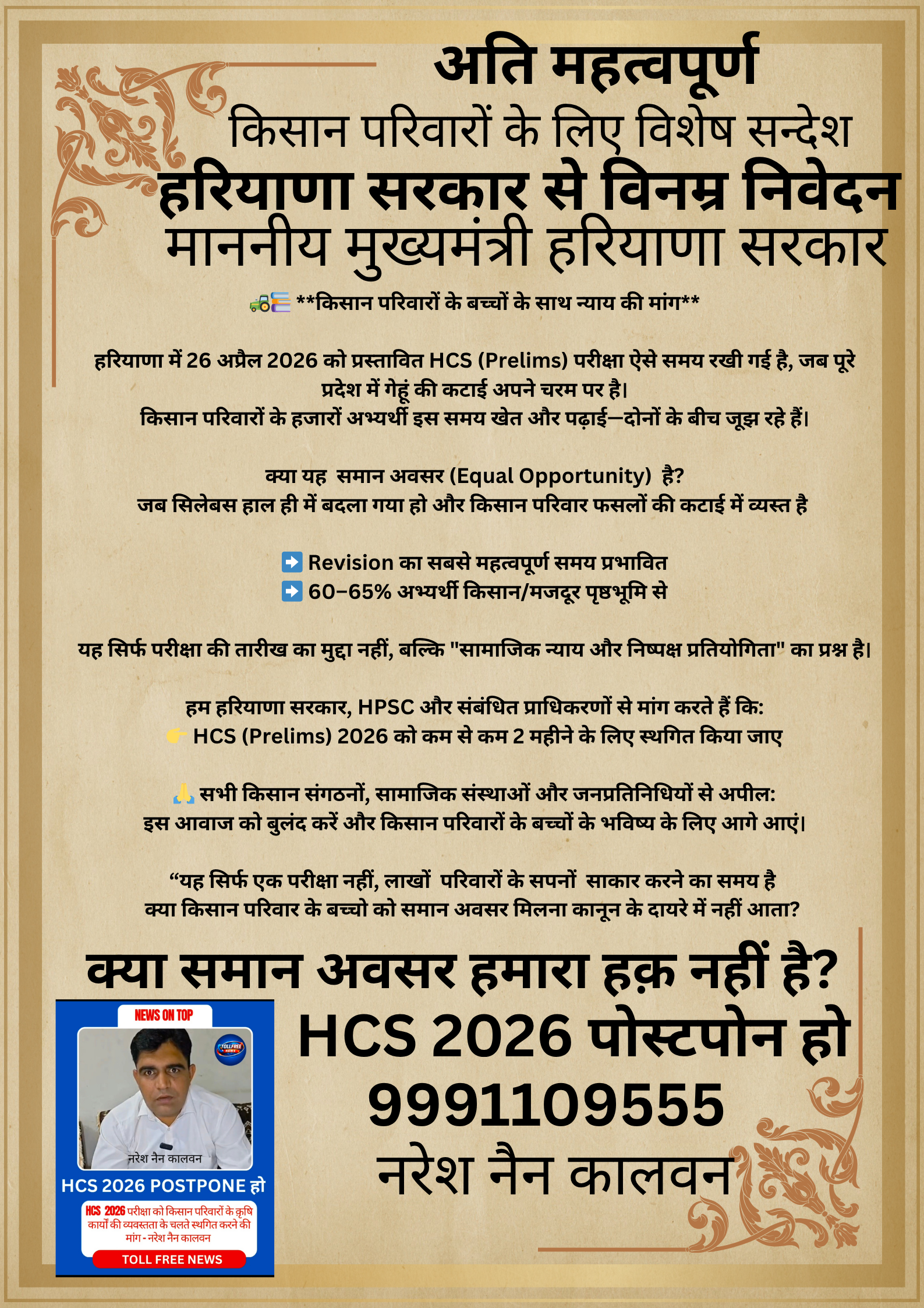अगर आप भी किसानों के बच्चे हैँ और हरियाणा की सबसे बड़ी परीक्षा HCS 2026 दे रहे हैँ तो इस समय क्या आप गेहूं की फसल के सीजन के चलते तैयारी कर पा रहे हैँ प्रदेश के 60 प्रतिशत किसानों के बच्चे परीक्षा दे रहे हैँ आइये समान अवसर के. सिद्धांत का पालन करने हेतू आवाज़ उठाएं