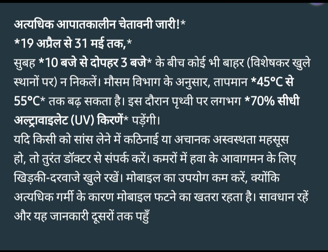 तापमान में होगी कुछ दिनों में वृद्धि आपको बताते चले 19 अप्रैल से लेकर 31 अप्रैल के बीच में मौसम विभाग ने अलर्ट जारी किया है जिससे कि तापमान 55 डिग्री से ऊपर पहुंचाने की संभावना है बच्चे एवं बुजुर्गों को चिकित्सकों ने विशेष सलाह दी है तथा शरीर में पानी की मात्रा को कम न होने दे हल्का एवं तरल पदार्थ भोजन ले .
