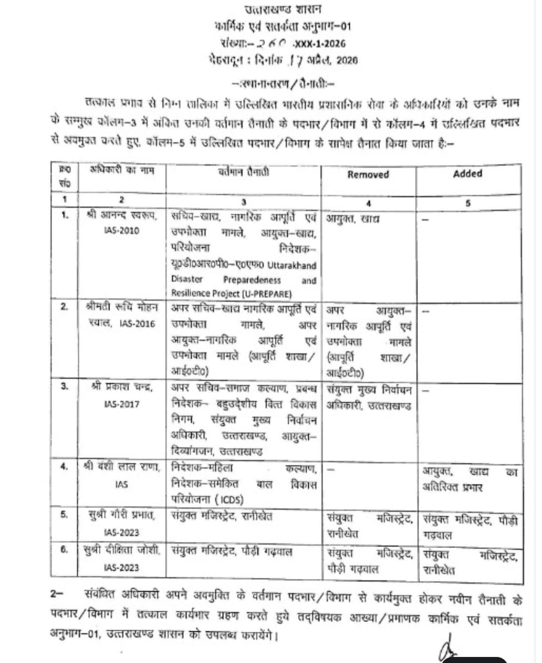 यह उत्तराखंड सरकार द्वारा 17 अप्रैल 2026 को जारी किया गया बड़ा प्रशासनिक फेरबदल है, जिसमें 6 IAS और 26 PCS अधिकारियों की जिम्मेदारियों में बदलाव किया