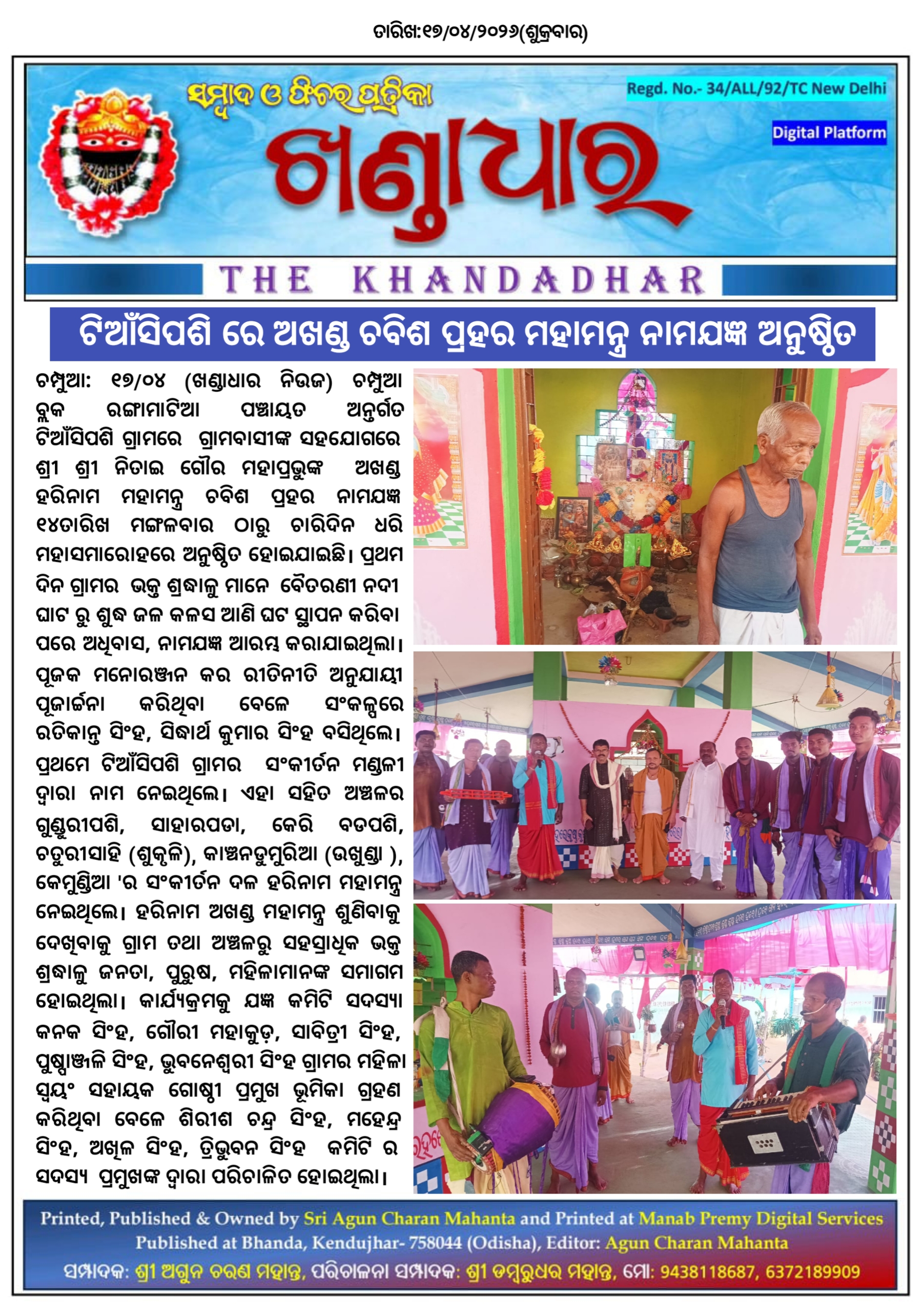 ଚମ୍ପୁଆ -୧୭/୦୪(ଖଣ୍ଡାଧାର ନିଉଜ ) ଚମ୍ପୁଆ ବ୍ଲକ ରଙ୍ଗାମାଟିଆ ପଞ୍ଚାୟତ ଅନ୍ତର୍ଗତ ଟିଆଁସିପଶି ଗ୍ରାମରେ ଗ୍ରାମବାସୀଙ୍କ ସହଯୋଗରେ ଶ୍ରୀ ଶ୍ରୀ ନିତାଇ ଗୌର ମହାପ୍ରଭୁଙ୍କ ଅଖଣ୍ଡ ହରିନାମ ମହାମନ୍ତ୍ର ଚବିଶ ପ୍ରହର ନାମଯଜ୍ଞ ୧୪ତାରିଖ ମଙ୍ଗଳବାର ଠାରୁ ଚାରିଦିନ ଧରି ମହାସମାରୋହରେ ଅନୁଷ୍ଠିତ ହୋଇଯାଇଛି l ପ୍ରଥମ ଦିନ ଗ୍ରାମର ଭକ୍ତ ଶ୍ରଦ୍ଧାଳୁ ମାନେ ବୈତରଣୀ ନଦୀ ଘାଟ ରୁ ଶୁଦ୍ଧ ଜଳ କଳସ ଆଣି ଘଟ ସ୍ଥାପନ କରିବା ପରେ ଅଧିବାସ, ନାମଯଜ୍ଞ ଆରମ୍ଭ କରାଯାଇଥିଲା l ପୂଜକ ମନୋରଞ୍ଜନ କର ରୀତିନୀତି ଅନୁଯାୟୀ ପୂଜାର୍ଚ୍ଚନା କରିଥିବା ବେଳେ ସଂକଳ୍ପରେ ରତିକାନ୍ତ ସିଂହ, ସିଦ୍ଧାର୍ଥ କୁମାର ସିଂହ ବସିଥିଲେ l ପ୍ରଥମେ ଟିଆଁସିପଶି ଗ୍ରାମର ସଂକୀର୍ତନ ମଣ୍ଡଳୀ ଦ୍ଵାରା ନାମ ନେଇଥିଲେ l ଏହା ସହିତ ଅଞ୍ଚଳର ଗୁଣ୍ଡୁରୀପଶି, ସାହାରପଡା, କେରି ବଡପଶି, ଚତୁରୀସାହି (ଶୁକୃଳି), କାଞ୍ଚନଡୁମୁରିଆ (ଉଖୁଣ୍ଡା ), କେମୁଣ୍ଡିଆ 'ର ସଂକୀର୍ତନ ଦଳ ହରିନାମ ମହାମନ୍ତ୍ର ନେଇଥିଲେ l ହରିନାମ ଅଖଣ୍ଡ ମହାମନ୍ତ୍ର ଶୁଣିବାକୁ ଦେଖିବାକୁ ଗ୍ରାମ ତଥା ଅଞ୍ଚଳରୁ ସହସ୍ରାଧିକ ଭକ୍ତ ଶ୍ରଦ୍ଧାଳୁ ଜନତା, ପୁରୁଷ, ମହିଳାମାନଙ୍କ ସମାଗମ ହୋଇଥିଲା l କାର୍ଯ୍ୟକ୍ରମକୁ ଯଜ୍ଞ କମିଟି ସଦସ୍ୟା କନକ ସିଂହ, ଗୌରୀ ମହାକୁଡ଼, ସାବିତ୍ରୀ ସିଂହ, ପୁଷ୍ପାଞ୍ଜଳି ସିଂହ, ଭୁବନେଶ୍ୱରୀ ସିଂହ ଗ୍ରାମର ମହିଳା ସ୍ୱୟଂ ସହାୟକ ଗୋଷ୍ଠୀ ପ୍ରମୁଖ ଭୂମିକା ଗ୍ରହଣ କରିଥିବା ବେଳେ ଶିରୀଶ ଚନ୍ଦ୍ର ସିଂହ, ମହେନ୍ଦ୍ର ସିଂହ, ଅଖିଳ ସିଂହ, ତ୍ରିଭୁବନ ସିଂହ କମିଟି 'ର ସଦସ୍ୟ ପ୍ରମୁଖଙ୍କ ଦ୍ଵାରା ପରିଚାଳିତ ହୋଇଥିଲା l