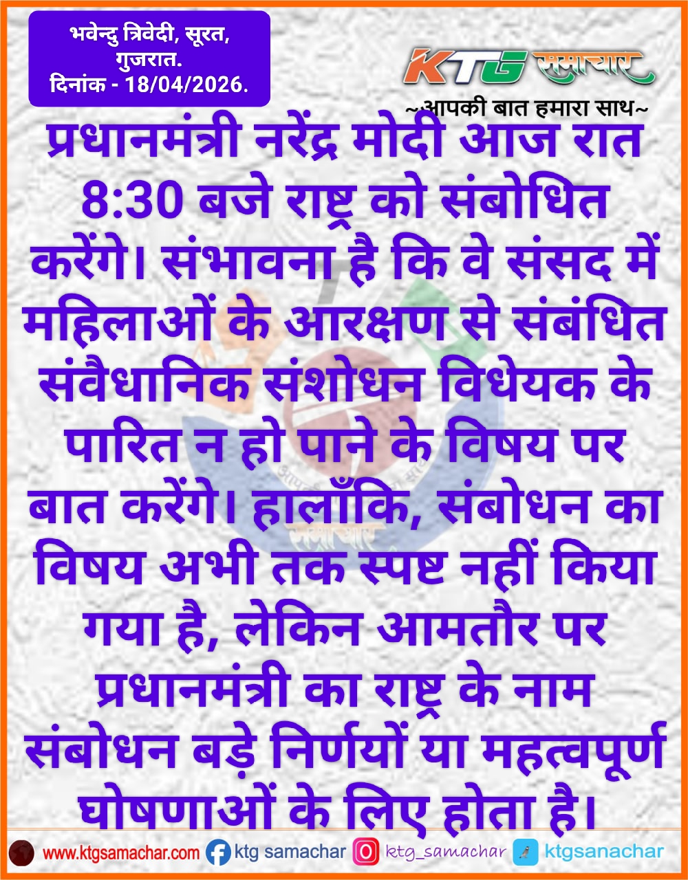 प्रधानमंत्री नरेंद्र मोदी आज रात 8:30 बजे राष्ट्र को संबोधित करेंगे।