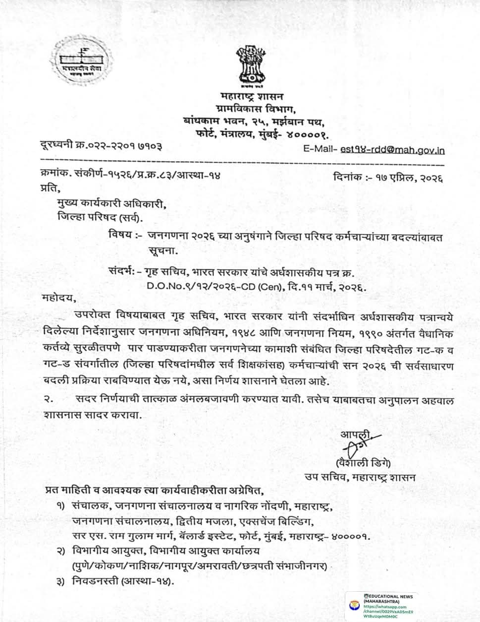 २०२६ च्या जनगणनेमुळे जिल्हा परिषद कर्मचाऱ्यांच्या बदल्यांना स्थगिती. महाराष्ट्र शासनाच्या ग्रामविकास विभागाने घेतलेला महत्त्वाचा निर्णय