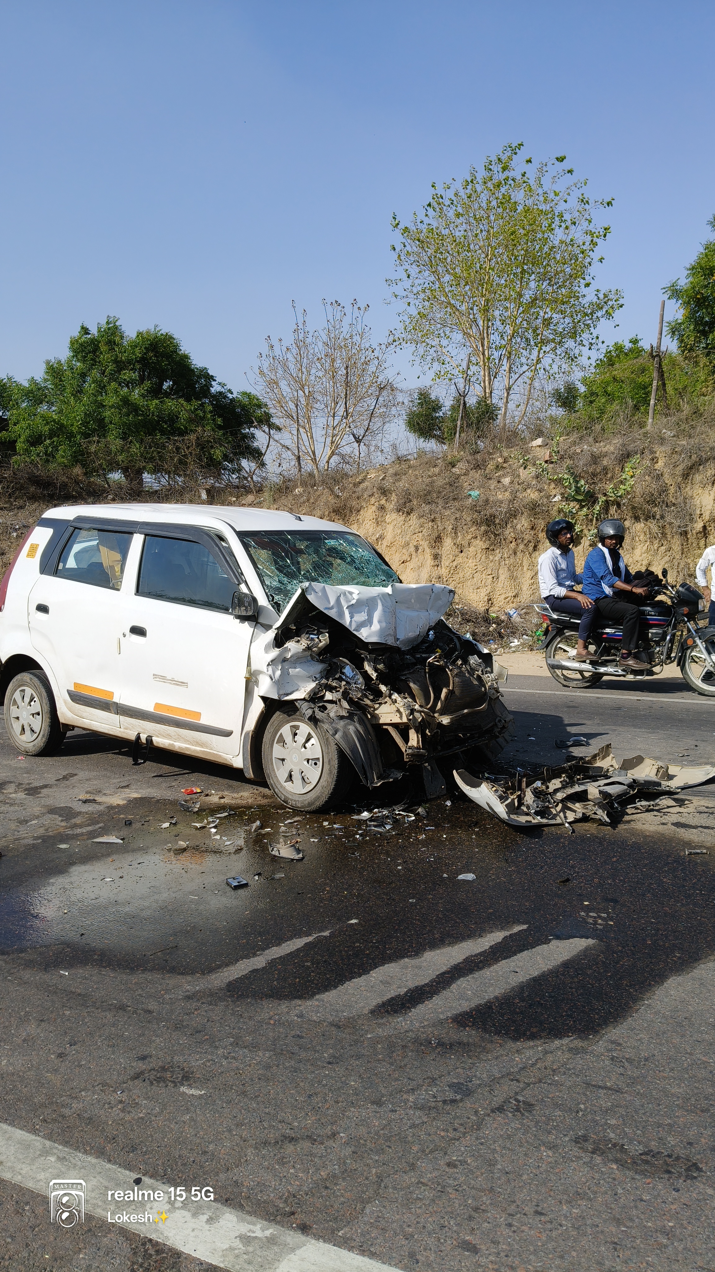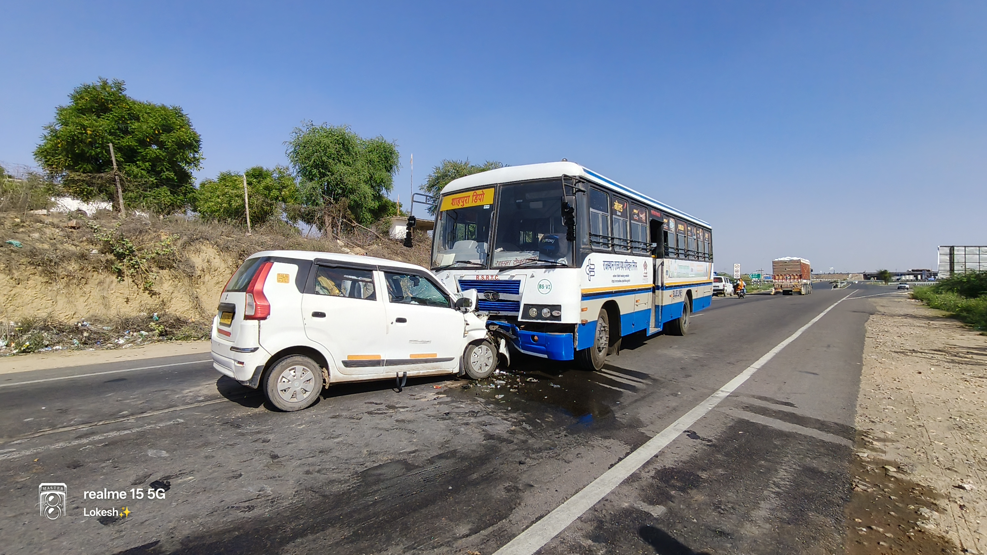 शाहपुरा (मनोहरपुर) – राजमार्ग पर दौसा के पास बापी बानगंगा पुल के ऊपर आज एक बड़ा सड़क हादसा होते-होते टल गया, जब एक वैगनआर कार और रोडवेज बस की आमने-सामने जोरदार टक्कर हो गई। प्रत्यक्षदर्शियों के अनुसार टक्कर इतनी तेज थी कि दोनों वाहनों के आगे के हिस्से बुरी तरह क्षतिग्रस्त हो गए।
