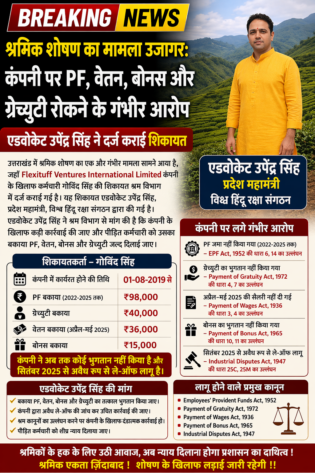 श्रमिक शोषण का मामला उजागर: कंपनी पर PF, वेतन, बोनस और ग्रेच्युटी रोकने के आरोप, एडवोकेट उपेंद्र सिंह ने दर्ज कराई शिकायत #upendrasingh