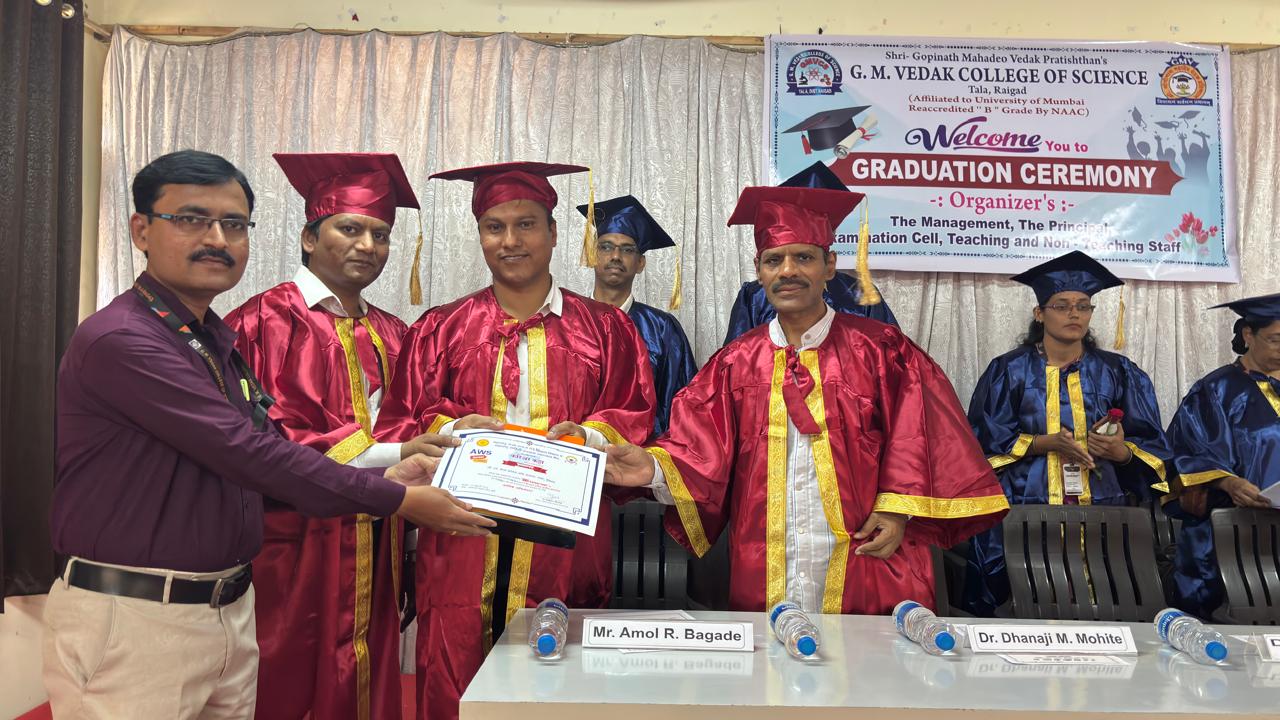 श्री गोपीनाथ महादेव वेदक प्रतिष्ठानचे जी.एम.वेदक कॉलेज ऑफ सायन्स तळा वार्षिक पदवी प्रदान सोहळा शनिवार, १८ एप्रिल रोजी महाविद्यालयाच्या सभागृहात अत्यंत उत्साहपूर्ण, दिमाखदार व शिस्तबद्ध वातावरणात पार पडला. विद्यार्थ्यांच्या शैक्षणिक प्रवासातील महत्त्वपूर्ण टप्पा साजरा करण्यासाठी आयोजित या सोहळ्यात विद्यार्थ्यांच्या यशाचा गौरव करत त्यांच्या उज्ज्वल भविष्यासाठी शुभेच्छा देण्यात आल्या.