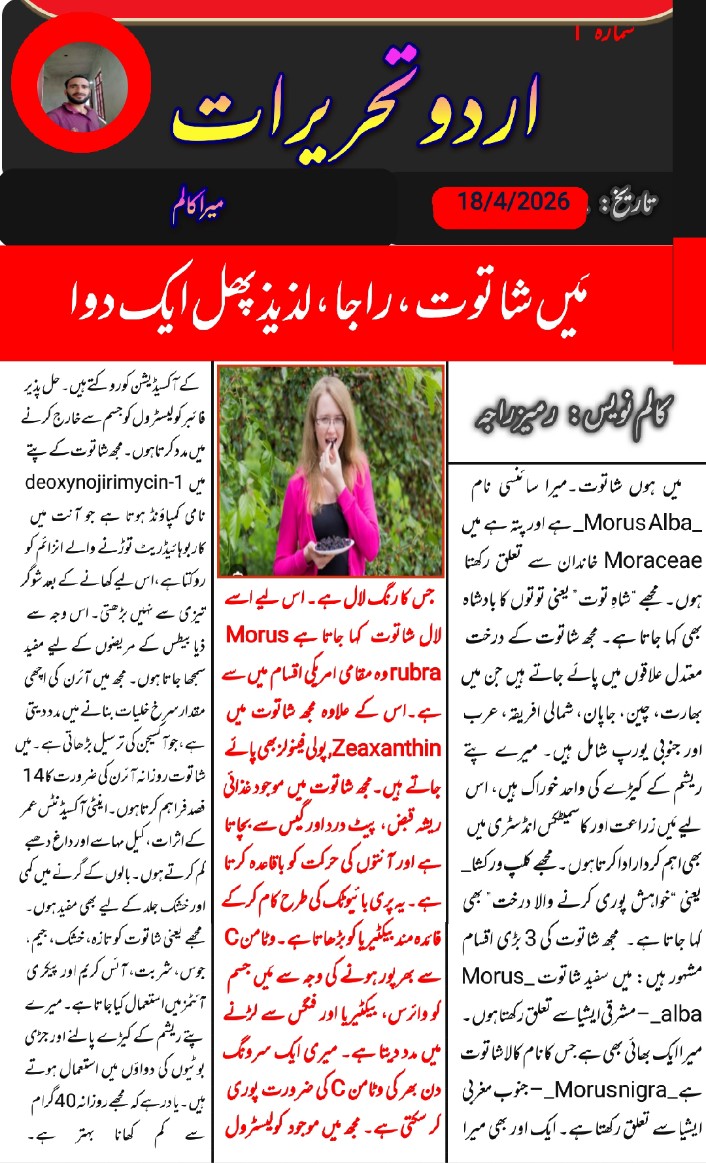 مَیں ہوں شاتوت، تمام توتوں کا شاہ،راجا اور بادشاہ،میں لذیذ پھل ہوں اور مکمل دوا بھی ہوں۔مَیں شاہِ توت ہوں۔ہاں! شاتوت