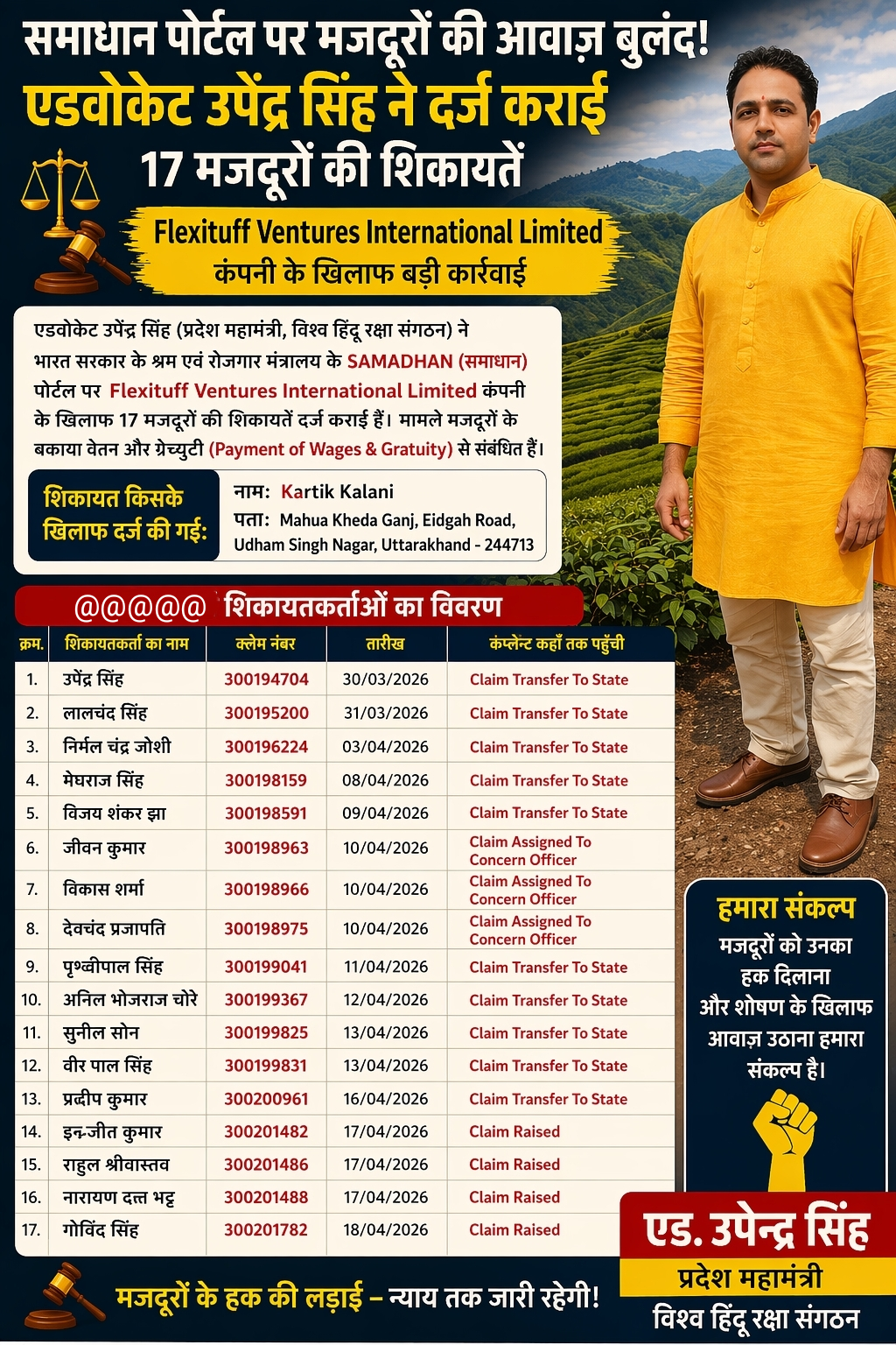 рдЙрдзрдо рд╕рд┐рдВрд╣ рдирдЧрд░ рд╕реЗ рдПрдХ рдмрдбрд╝рд╛ рдорд╛рдорд▓рд╛ рд╕рд╛рдордиреЗ рдЖрдпрд╛ рд╣реИ, рдЬрд╣рд╛рдВ рдПрдбрд╡реЛрдХреЗрдЯ рдЙрдкреЗрдВрджреНрд░ рд╕рд┐рдВрд╣ (рдкреНрд░рджреЗрд╢ рдорд╣рд╛рдордВрддреНрд░реА, рд╡рд┐рд╢реНрд╡ рд╣рд┐рдВрджреВ рд░рдХреНрд╖рд╛ рд╕рдВрдЧрдарди) рдиреЗ рдордЬрджреВрд░реЛрдВ рдХреЗ рд╣рдХ рдХреА рд▓рдбрд╝рд╛рдИ рдХреЛ рддреЗрдЬ рдХрд░рддреЗ рд╣реБрдП рднрд╛рд░рдд рд╕рд░рдХрд╛рд░ рдХреЗ рд╢реНрд░рдо рдПрд╡рдВ рд░реЛрдЬрдЧрд╛рд░ рдордВрддреНрд░рд╛рд▓рдп рдХреЗ SAMADHAN (рд╕рдорд╛рдзрд╛рди) рдкреЛрд░реНрдЯрд▓ рдкрд░ рдПрдХ рд╕рд╛рде рдХрдИ рд╢рд┐рдХрд╛рдпрддреЗрдВ рджрд░реНрдЬ рдХрд░рд╛рдИ рд╣реИрдВред