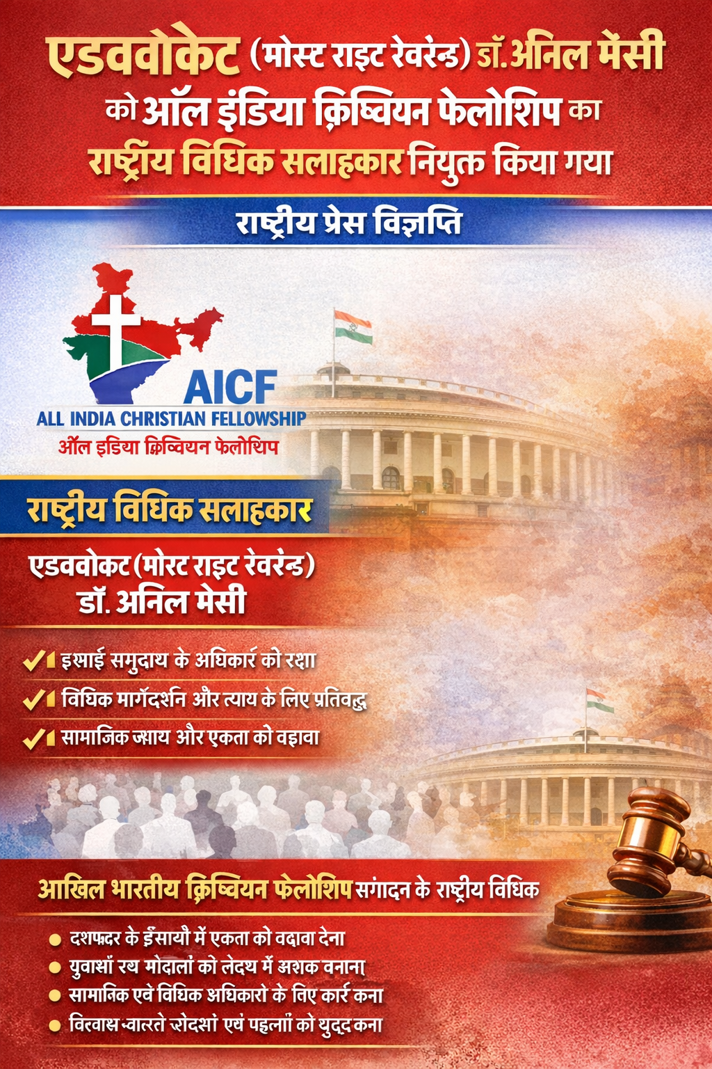 राष्ट्रीय समाचार / प्रेस विज्ञप्ति एडवोकेट (मोस्ट राइट रेवरेन्ड) डॉ. अनिल मैसी बने ऑल इंडिया क्रिश्चियन फेलोशिप के राष्ट्रीय विधिक सलाहकार