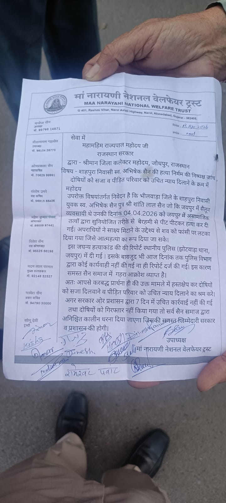 जोधपुर, 18 अप्रैल। भीलवाड़ा जिले के शाहपुरा निवासी स्वर्गीय अभिषेक सैन, पुत्र श्री शांति लाल सैन की जयपुर में 04 अप्रैल 2026 को असामाजिक तत्वों द्वारा की गई निर्मम हत्या के विरोध में शनिवार को जोधपुर में जिला कलेक्टर महोदय को ज्ञापन सौंपा गया। यह ज्ञापन महामहिम राज्यपाल महोदय, राजस्थान सरकार के नाम प्रेषित किया गया।