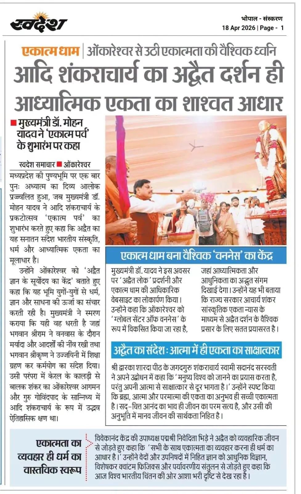 मुख्यमंत्री डॉ. मोहन यादव ने आदि शंकराचार्य के प्रकटोत्सव "एकात्म पर्व" का किया शुभारंभ