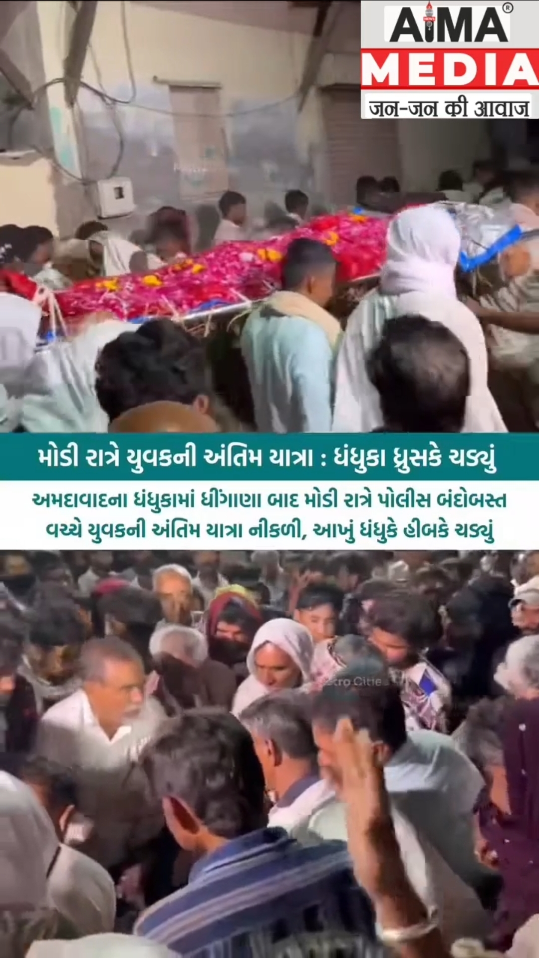 મોડી રાત્રે યુવકની અંતિમ યાત્રા : ધંધુકા ધુસકે ચડ્યું અમદાવાદના ધંધુકામાં ધીંગાણા બાદ મોડી રાત્રે પોલીસ બંદોબસ્ત| વચ્ચે યુવકની અંતિમ યાત્રા નીકળી.