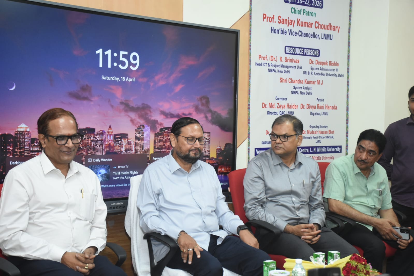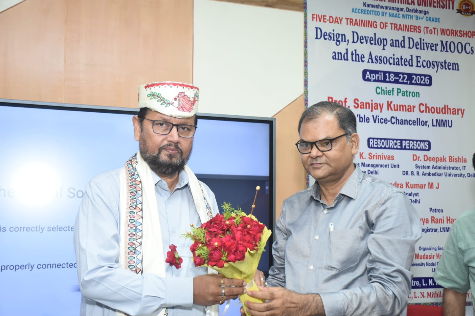 ललित नारायण मिथिला विश्वविद्यालय, दरभंगा के एडवांस्ड रिसर्च सेन्टर में SWAYAM/MOOCs एवं इससे जुड़े इकोसिस्टम के डिजाइन, विकास तथा वितरण विषय पर प्रशिक्षकों के प्रशिक्षण [Training of Trainers (ToT)] के लिए दिनांक 18.04.2026 से 22.04.2026 तक पाँच दिवसीय कार्यशाला का शुभारम्भ कुलपति-सह-मुख्य संरक्षक प्रोफेसर संजय कुमार चौधरी के द्वारा किया गया। कुलपति ने इस प्रशिक्षण के महत्त्वों को रेखांकित करते हुए प्रशिक्षकों से पूरे तन एवं मन से स्वयं प्रशिक्षण प्राप्त कर सभी कॉलेजों में दूसरे शिक्षकों को भी प्रशिक्षित करने तथा विश्वविद्यालय को अधिक से अधिक लाभ पहुंचाने का निर्देश दिया। उन्होंने प्रशिक्षण ले रहे सभी शिक्षकों को बधाई एवं शुभकामनाएं देते हुए कहा कि शिक्षकों में हमेशा सीखने की प्रवृत्ति होनी चाहिए, ताकि वे विश्वविद्यालय की अपेक्षाओं पर खरे उतर सकें। मुख्य अतिथि के रूप में विश्वविद्यालय भौतिकी विभाग के विभागाध्यक्ष-सह-प्रो इंचार्ज, एआरसी प्रो मो नौशाद आलम की गरिमामय उपस्थिति रही। कार्यशाला के संरक्षक कुलसचिव डॉ दिव्या रानी हँसदा, संयोजक डॉ मो ज्या हैदर, निदेशक, आईक्यूएसी, कार्यशाला समन्वयक डॉ अनीन्द्र शर्मा एवं विश्वविद्यालय नोडल पदाधिकारी स्वयं सह आयोजन सचिव डॉ मुदासिर हसन भट्ट उपस्थित रहे। अतिथियों का स्वागत पाग, चादर, बुके एवं मोमेंटो से किया गया।