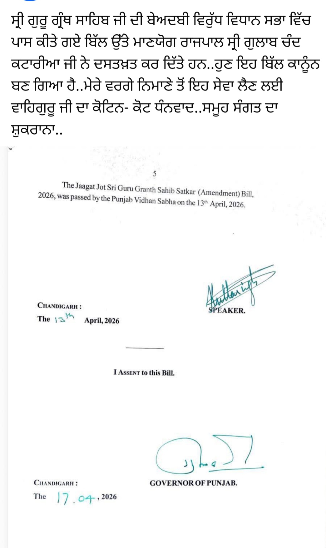 ਮਾਨ ਯੋਗ ਰਾਜਪਾਲ ਸ਼੍ਰੀ ਗੁਲਾਬ ਚੰਦ ਕਟਾਰੀਆਂ ਜ਼ੀ ਨੇ ਦਸਤਖਤ ਕਰ ਦਿੱਤੇ ਹਨ