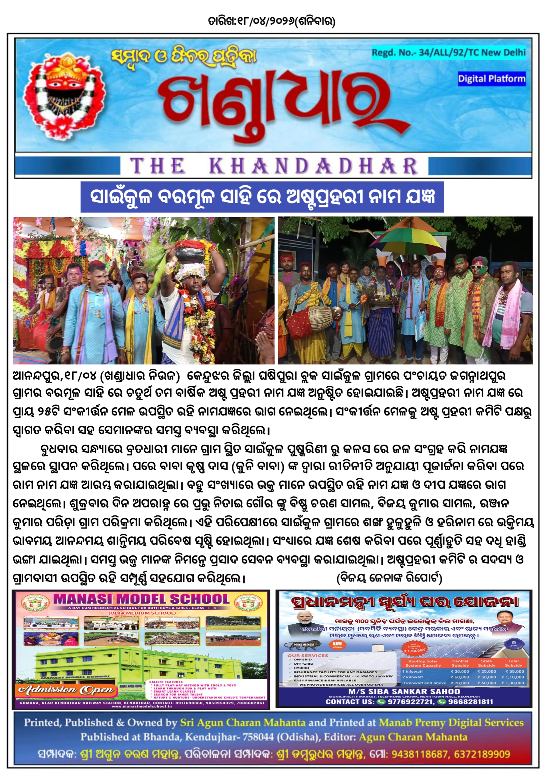 ଆନନ୍ଦପୁର,୧୮।୦୪: କେନ୍ଦୁଝର ଜିଲ୍ଲା ଘଷିପୁରା ବ୍ଲକ ସାଇଁକୁଳ ଗ୍ରାମରେ ପଂଚାୟତ ଜଗନ୍ନାଥପୁର ଗ୍ରାମର ବରମୂଳ ସାହି ରେ ଚତୁର୍ଥ ତମ ବାର୍ଷିକ ଅଷ୍ଟ ପ୍ରହରୀ ନାମ ଯଜ୍ଞ ଅନୁଷ୍ଟିତ ହୋଇଯାଇଛି। ଅଷ୍ଟପ୍ରହରୀ ନାମ ଯଜ୍ଞ ରେ ପ୍ରାୟ ୨୫ଟି ସଂକୀର୍ତ୍ତନ ମେଳ ଉପସ୍ଥିତ ରହି ନାମଯଜ୍ଞରେ ଭାଗ ନେଇଥିଲେ। ସଂକୀର୍ତ୍ତନ ମେଳକୁ ଅଷ୍ଟ ପ୍ରହରୀ କମିଟି ପକ୍ଷରୁ ସ୍ୱାଗତ କରିବା ସହ ସେମାନଙ୍କର ସମସ୍ତ ବ୍ୟବସ୍ଥା କରିଥିଲେ।