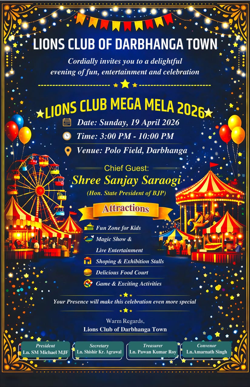 लॉयन्स क्लब ऑफ दरभंगा टाउन के द्वारा *19 अप्रैल* को यानि कि आज *लॉयन्स मेगा मेला 2026* का आयोजन