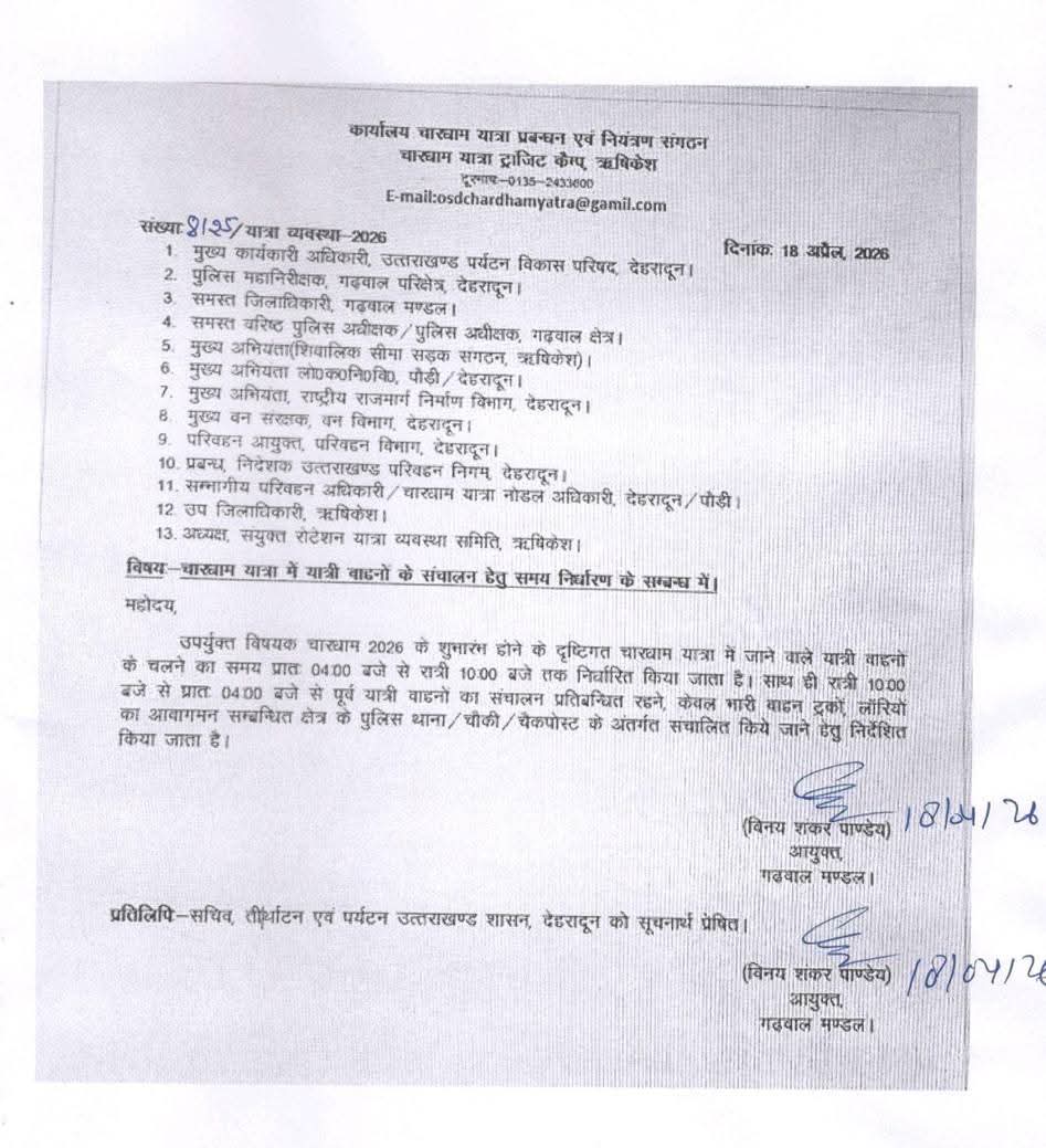 चारधाम यात्रा-2026 के सुचारू संचालन हेतु प्रशासन द्वारा आवश्यक दिशा-निर्देश जारी किए गए हैं। यात्रा अवधि के दौरान यातायात एवं श्रद्धालुओं की सुविधा को ध्यान में रखते हुए विशेष व्यवस्थाएं लागू की जाएंगी।
