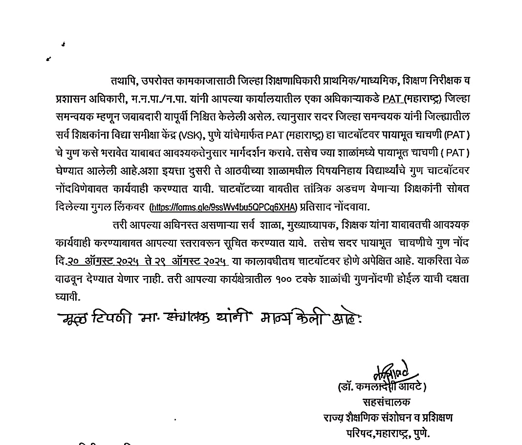 राज्यातील सर्व मुख्याध्यापक, शिक्षक व शिक्षण प्रशासनाने तातडीने आवश्यक कार्यवाही करून विद्यार्थ्यांचे गुण वेळेत नोंदवावेत, असे आवाहन करण्यात आले आहे. शैक्षणिक गुणवत्ता सुधारण्यासाठी PAT चाचणी अत्यंत महत्त्वाची असल्याचे शिक्षण विभागाने स्पष्ट केले आहे.